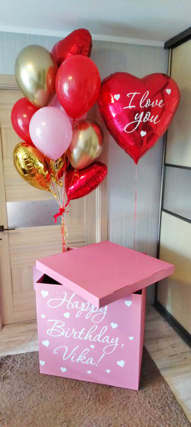 Such a special gift: a large box is delivering to the receiver. She opens it and... ballons fly up!! However they won't fly away to the heaven as there is a special weight that still keeps them as it is shown at our photo.