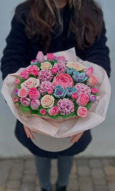 A really unbelievable gift! Mix of flowers, a huge variety of flower types and their shades. By the way, all the paints used are absolutely natural, obtained from vegetables, fruits and berries. Arrangement is made at the hat box - same type as a real live flowers are arranging.