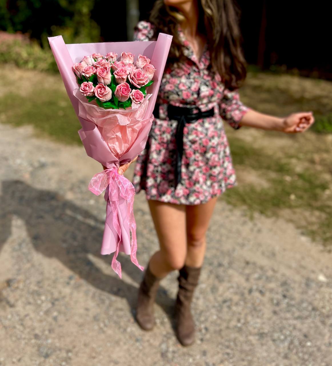 Our main photo shows 11 roses + 3 buds bouquet, the last additional photo shows 25 roses bouquet in a lady's hands. It shows clearly the size of the bouquet. By the way this is the author of all introducing chocolate masterpeices.