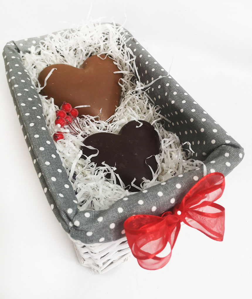 Every heart packed in a transparent package with a ribbon. Then it is set into a twigged tray or into a gift box of appropriate size and festive decoration.