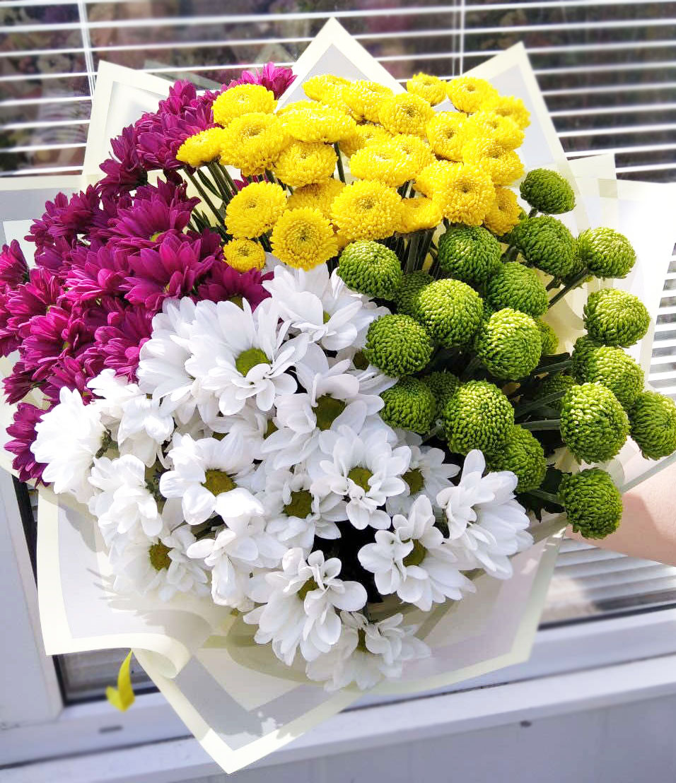An extraordinary bouquet of 4 kinds of chrysanthemums designed like a ball.