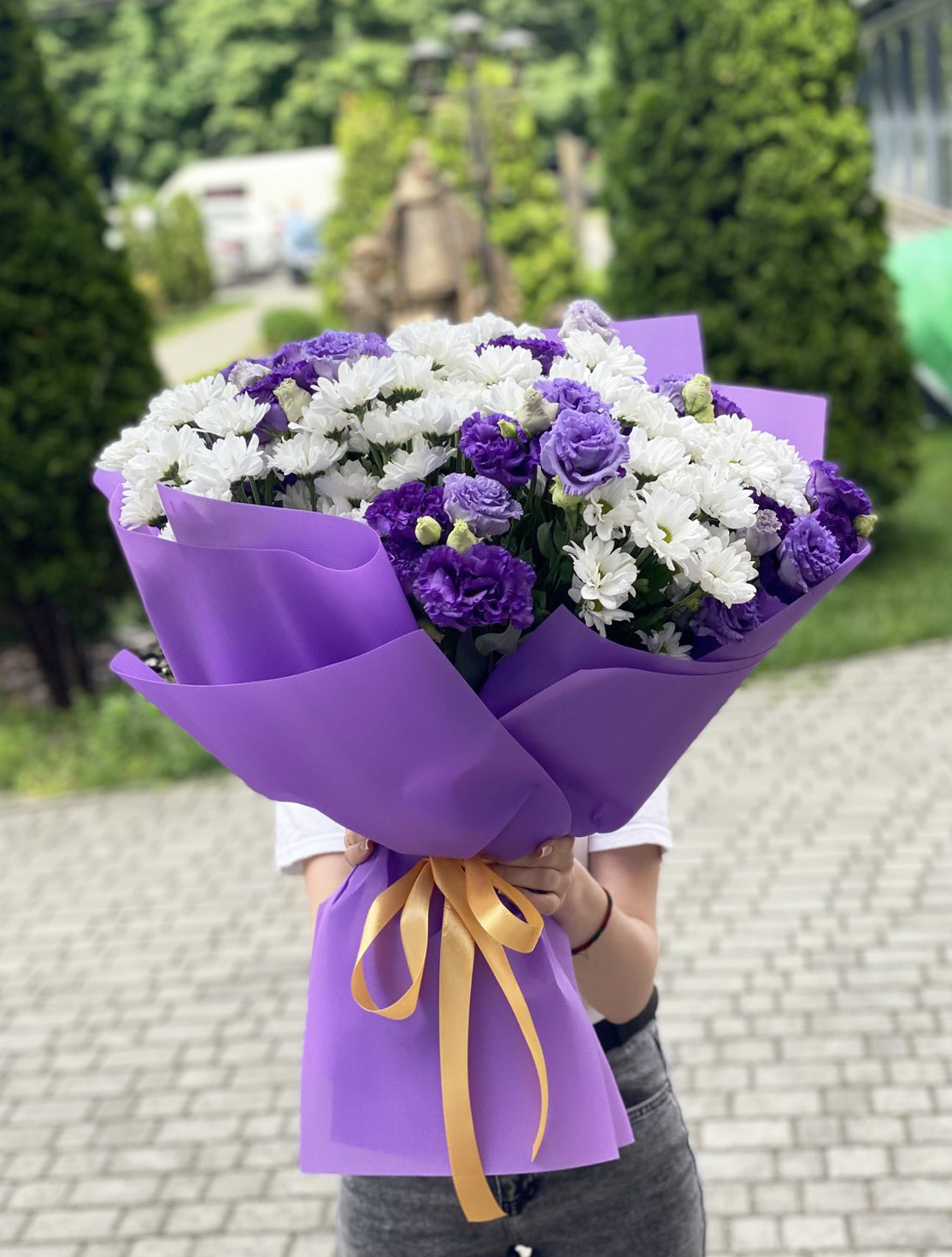 Fresh and tender looking bouquet of so loved by our local women white chrysanthemums-camomilies surrounding a blue color flowers... It can be either irises in a spring season like it is sjown at our photo, or blue eustoma, or... other blue or dark blue flowers that are available at the moment.