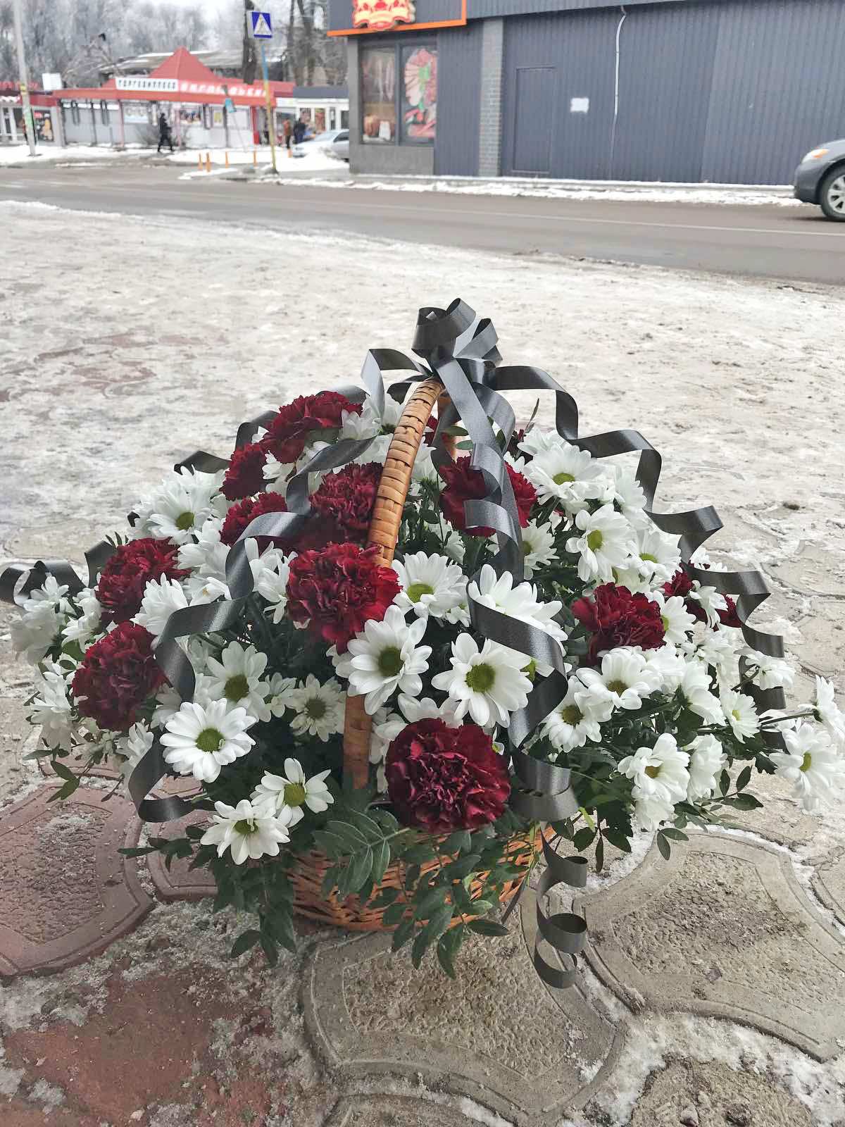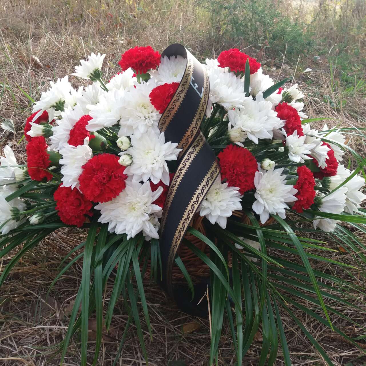 The basket cosists of 16 red carnations and 16 snow white chrysanthemums