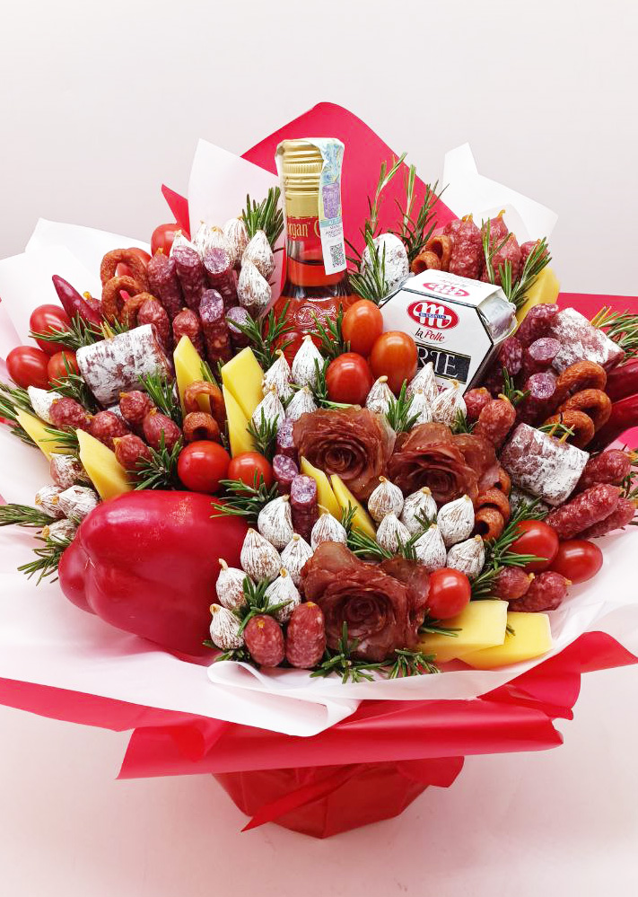 A wonderful gift for a man for his birthday, anniversary, or for any family holiday, such as Christmas, Easter, New Year, etc. A set includes a several types of sausages of the highest quality, cheese, sliced meats and magnificent red pepper pods completes the amazing view.