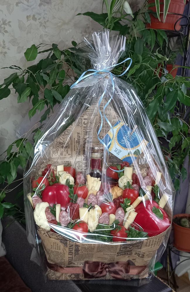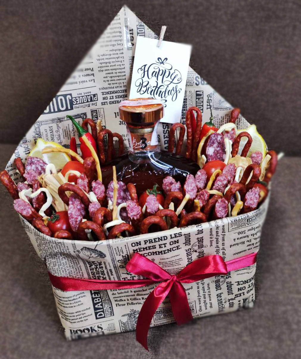 Such envelope with a bottle of Ukraine made cognac of 0,5-0,7 L, cheeses, sausages, peppers, tomatos, lemons is very popular gift for a man of any age. It is funny, looks as a great gift and is a real enjoyment!