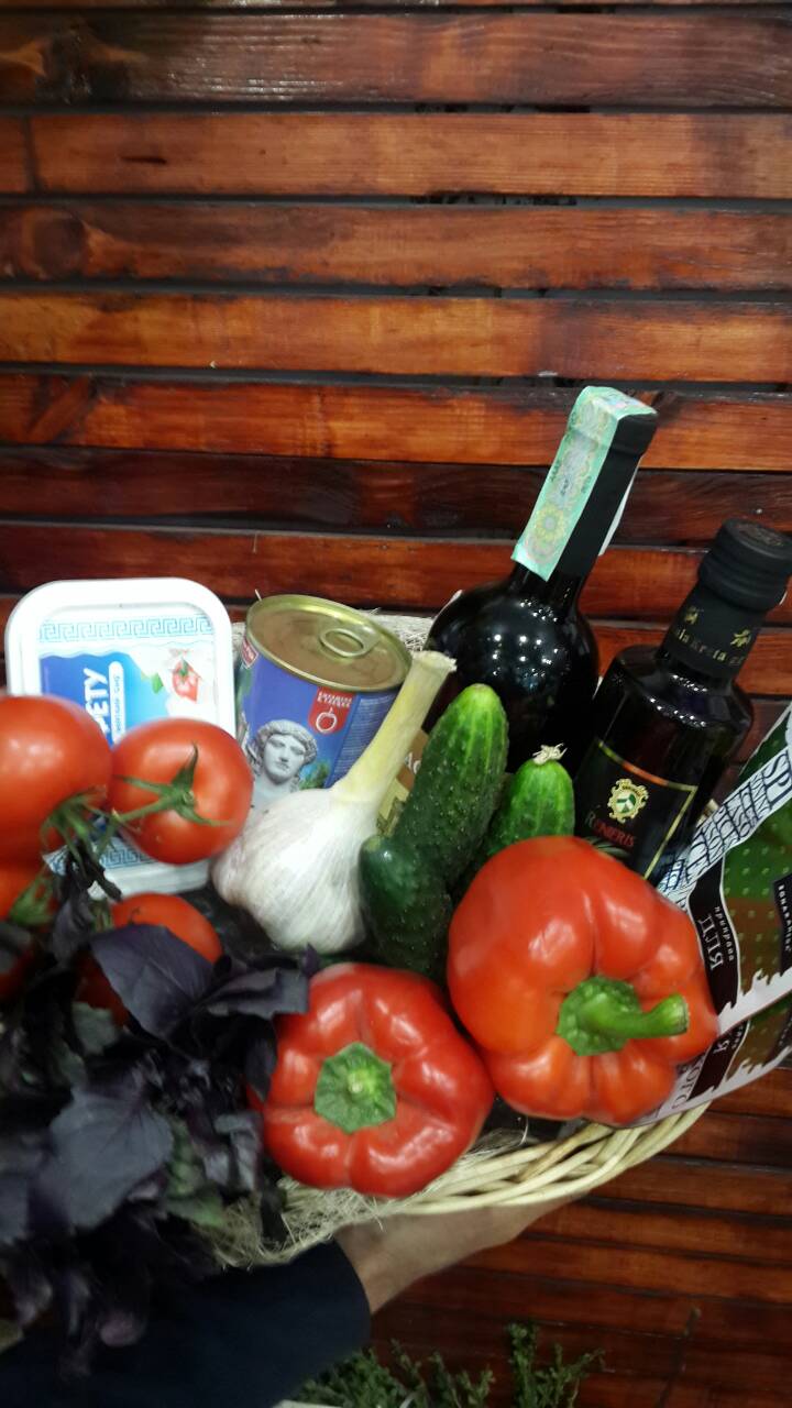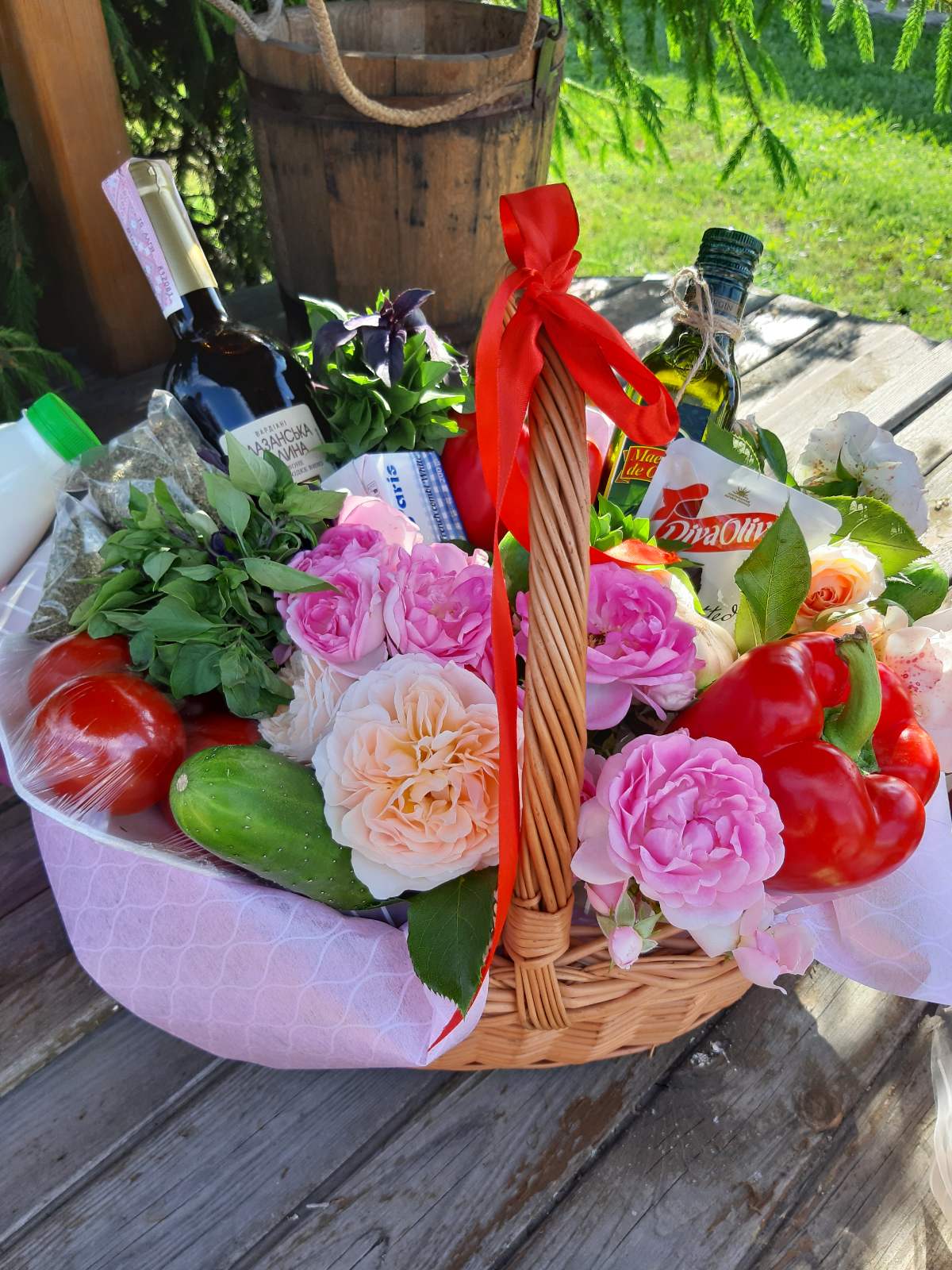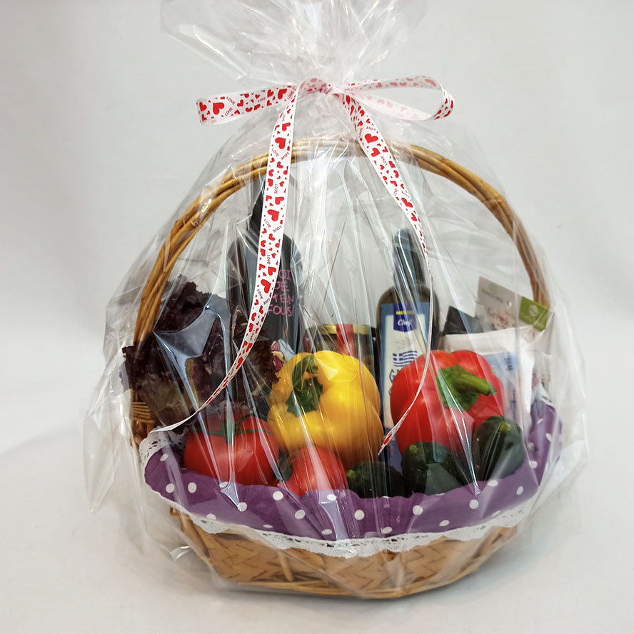 All the ingredients are tenderly set int oa wicker basket , packed into a transparent overwrap and decorated with a big bow.