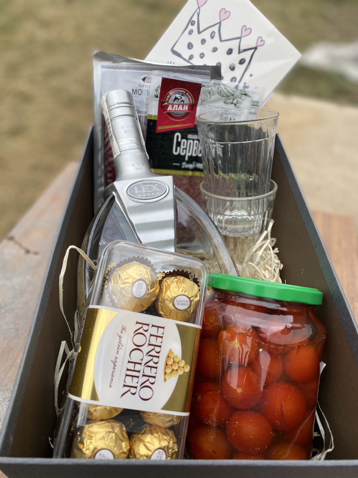 1 x bottle of Vodka Nemiroff Premium, 0.7 L 2 x faceted glasses as a reminder of a far past 1 x sausage boiled-smoked, sliced, 100 gr. 1 x sausage smoked, sliced, 100 gr. 1 х Jar of pickled tomatoes