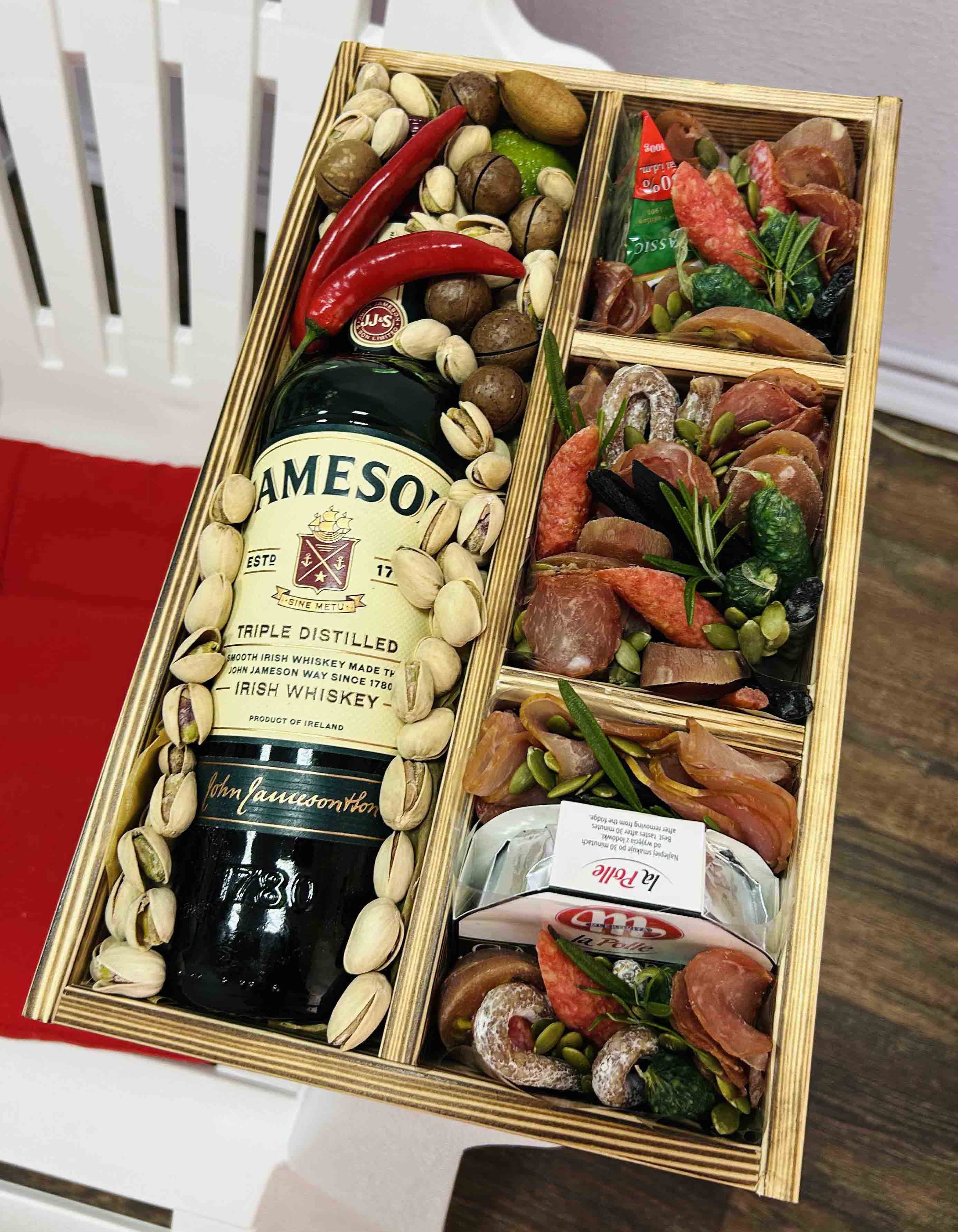 We propose this Box with the Jameson Irish whiskey at the center of composition is really a nice gift for a man, however it could be sent for a family and for a woman as well for any holiday, like Christmas, Easter, New Year, Birthday, etc. when a family gets together for a holiday table for celebration.