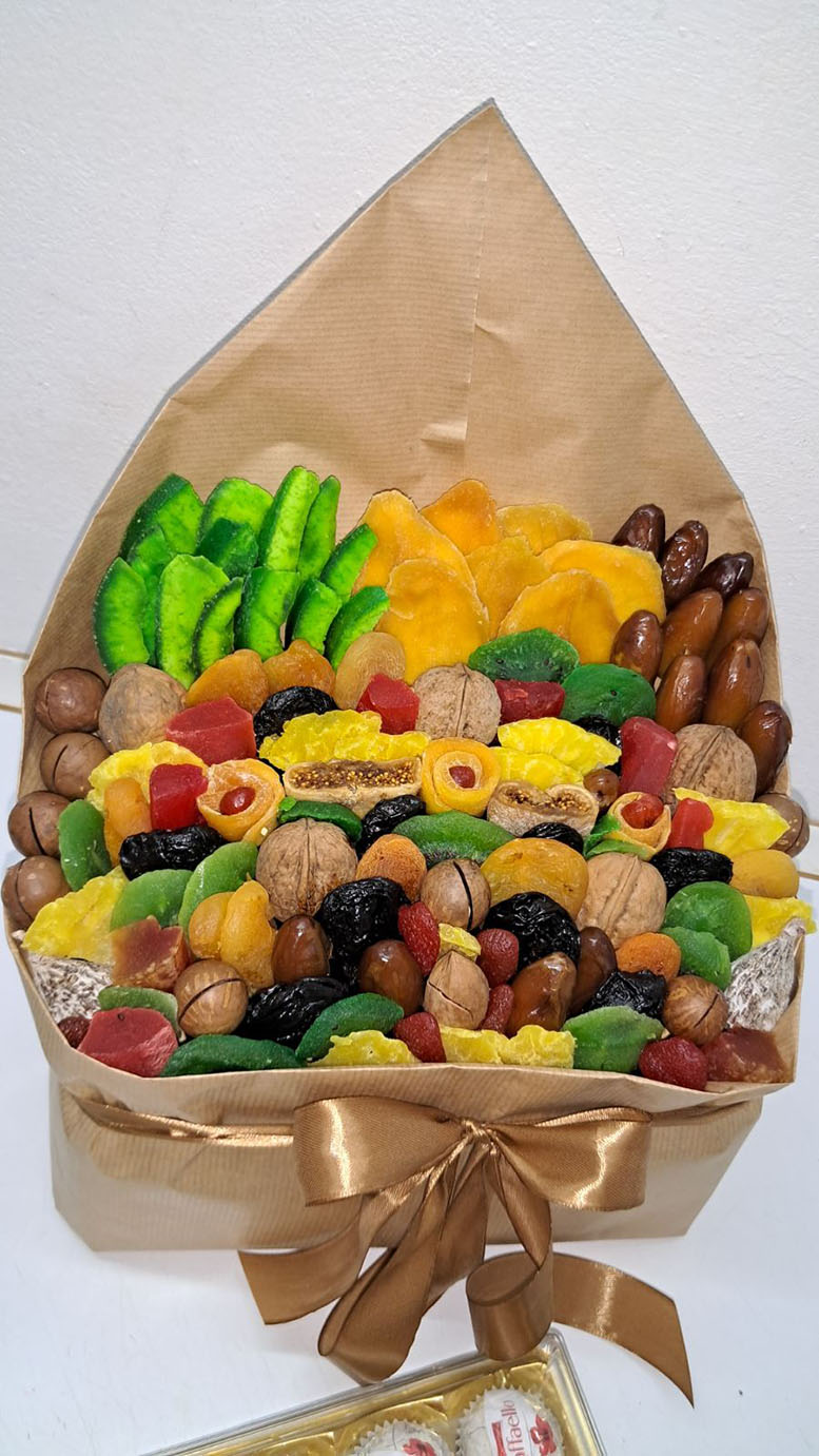 We are a flower shop and all gifts that are NOT flowers require more time for preparation. So, please, order this gift at least 3-4 days prior delivery. This arrangement will be made by its Author - professional Candied fruits designer and mailed to the delivery destination for the personal delivery.