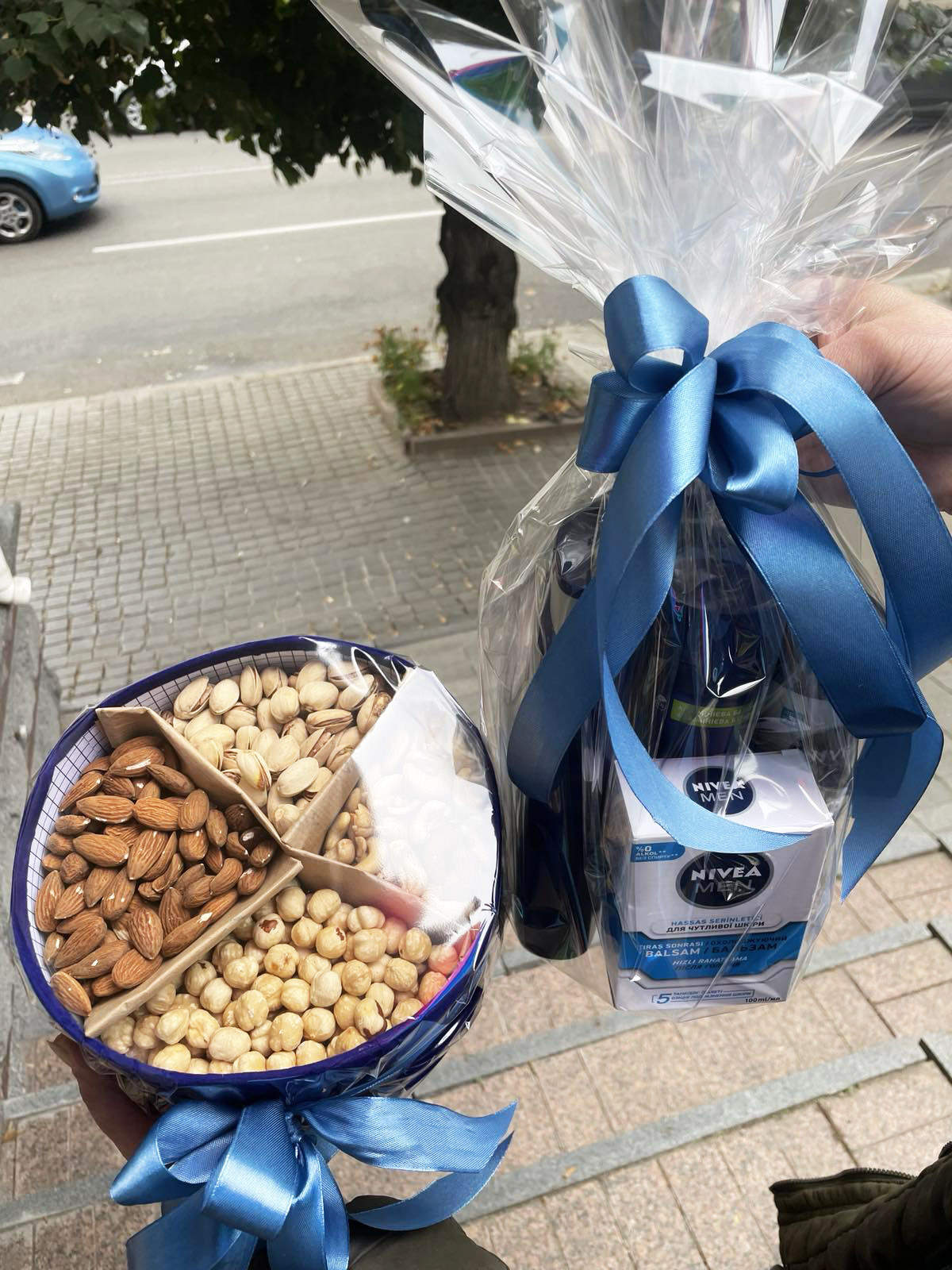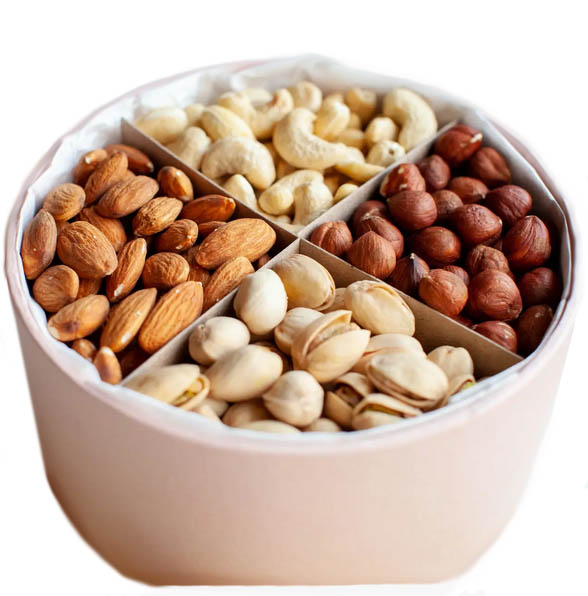 Small: .....800 grams total (200 grams of each kind of nuts) Medium: 1000 grams total (250 grams of each kind of nuts) Large:.. 1400 grams total (350 grams of each kind of nuts)