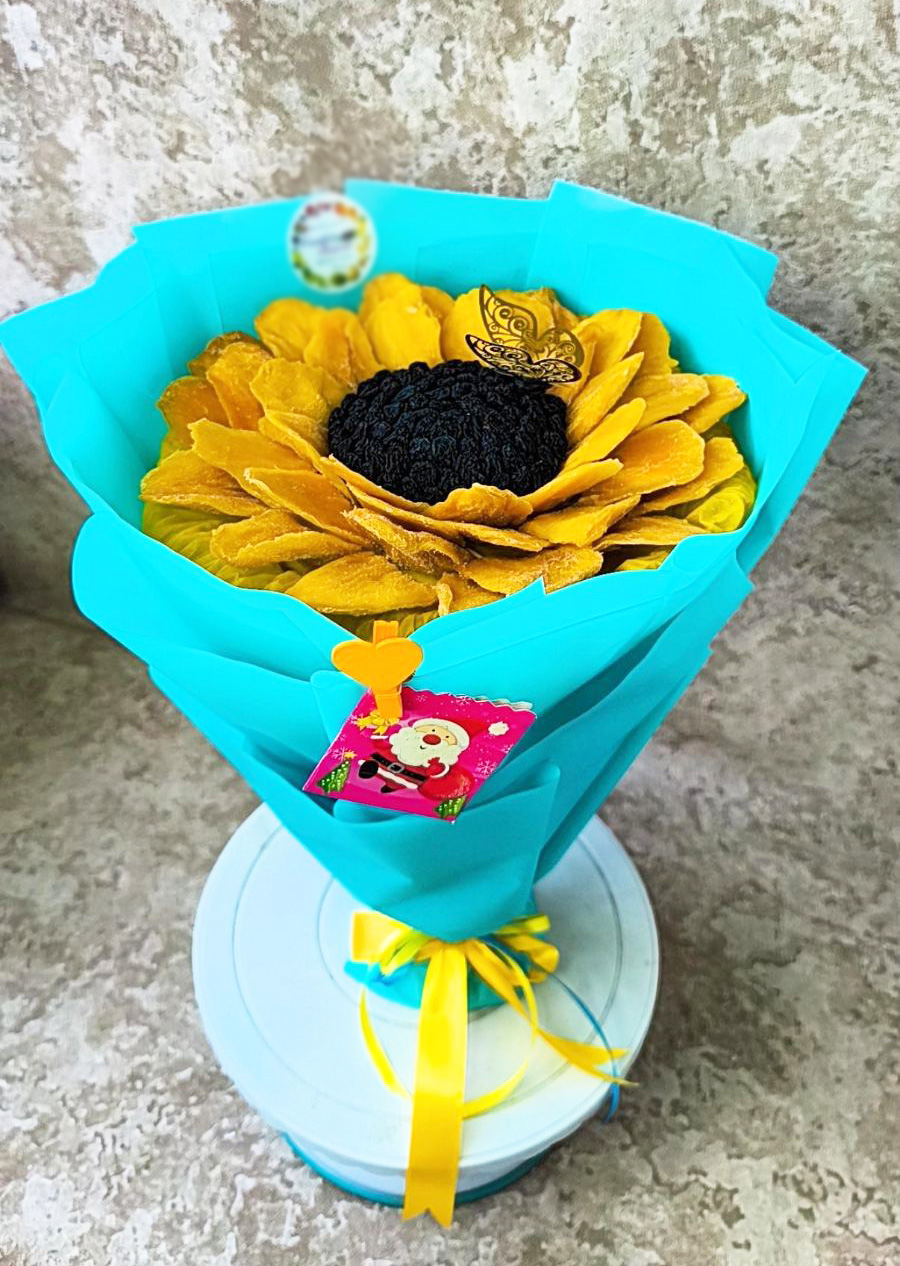 It's hard to believe that this beautiful flower is a work of art made from candied mango and raisins.