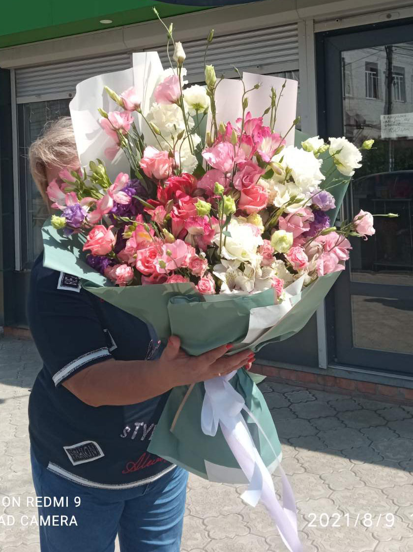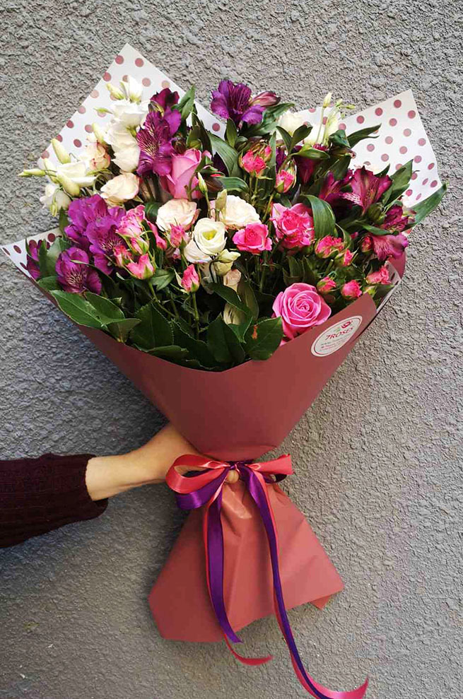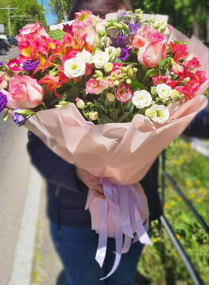 This bouquet attracts all eyes! The amazingly beautiful bouquet looks really luxury! Such effect is given by the special structure of each branch there. Each branch of both eustoma and a bush rose consist of 3-5 small branches covered with leafs and the flower or a bud on the top.
