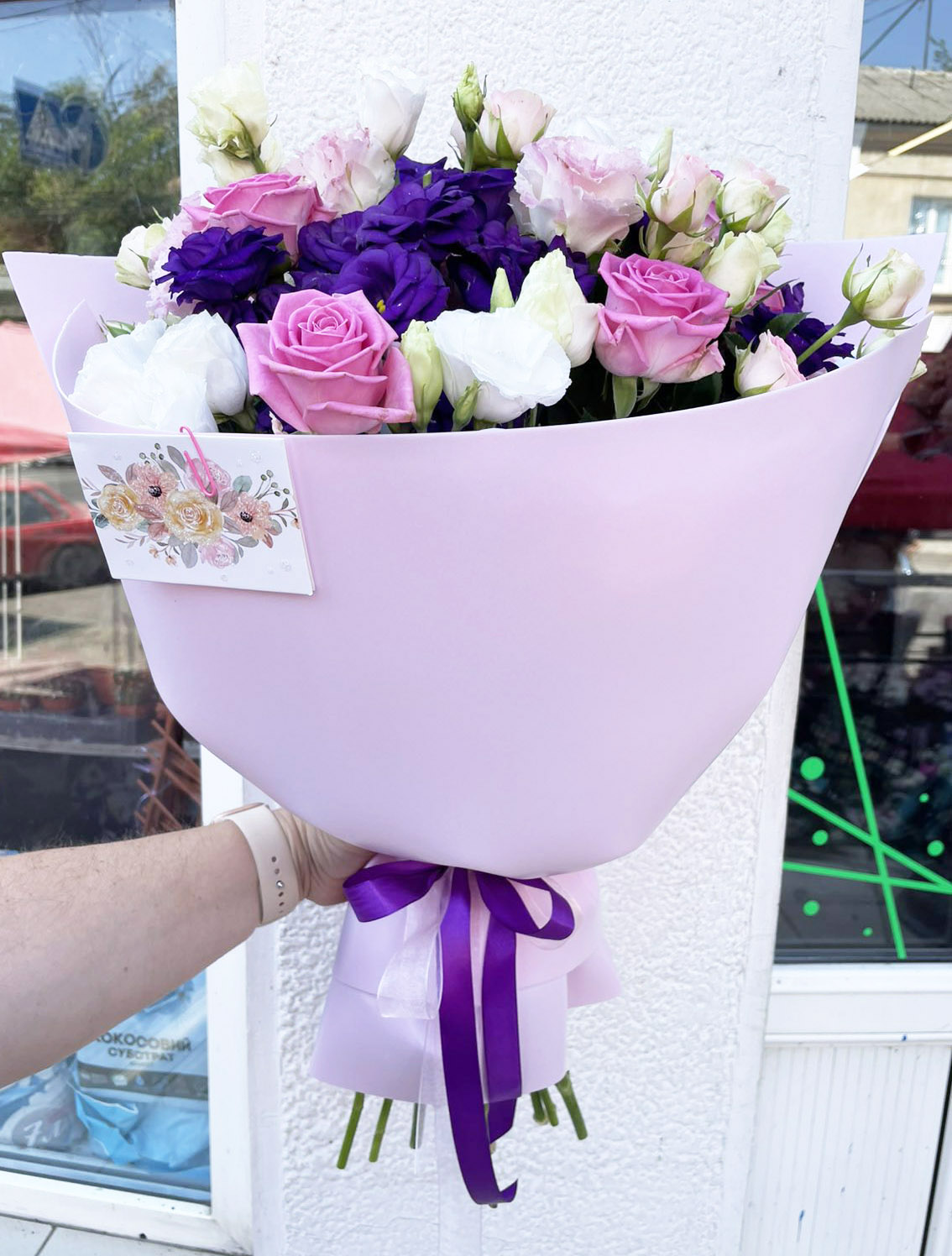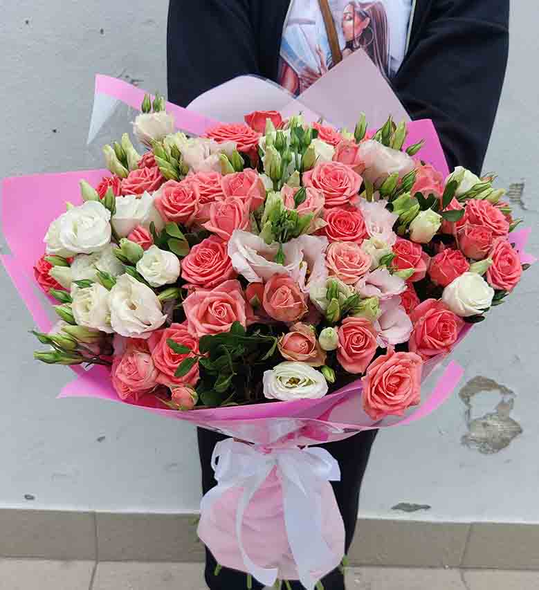 3 x branches of white, pink and lilac Eustoma 2 x pink Roses 1 x branches of the pink bush Roses