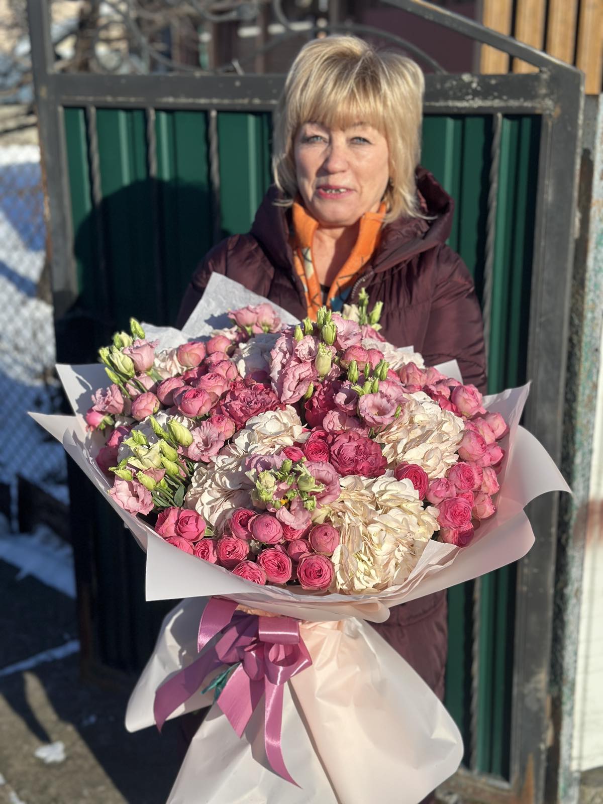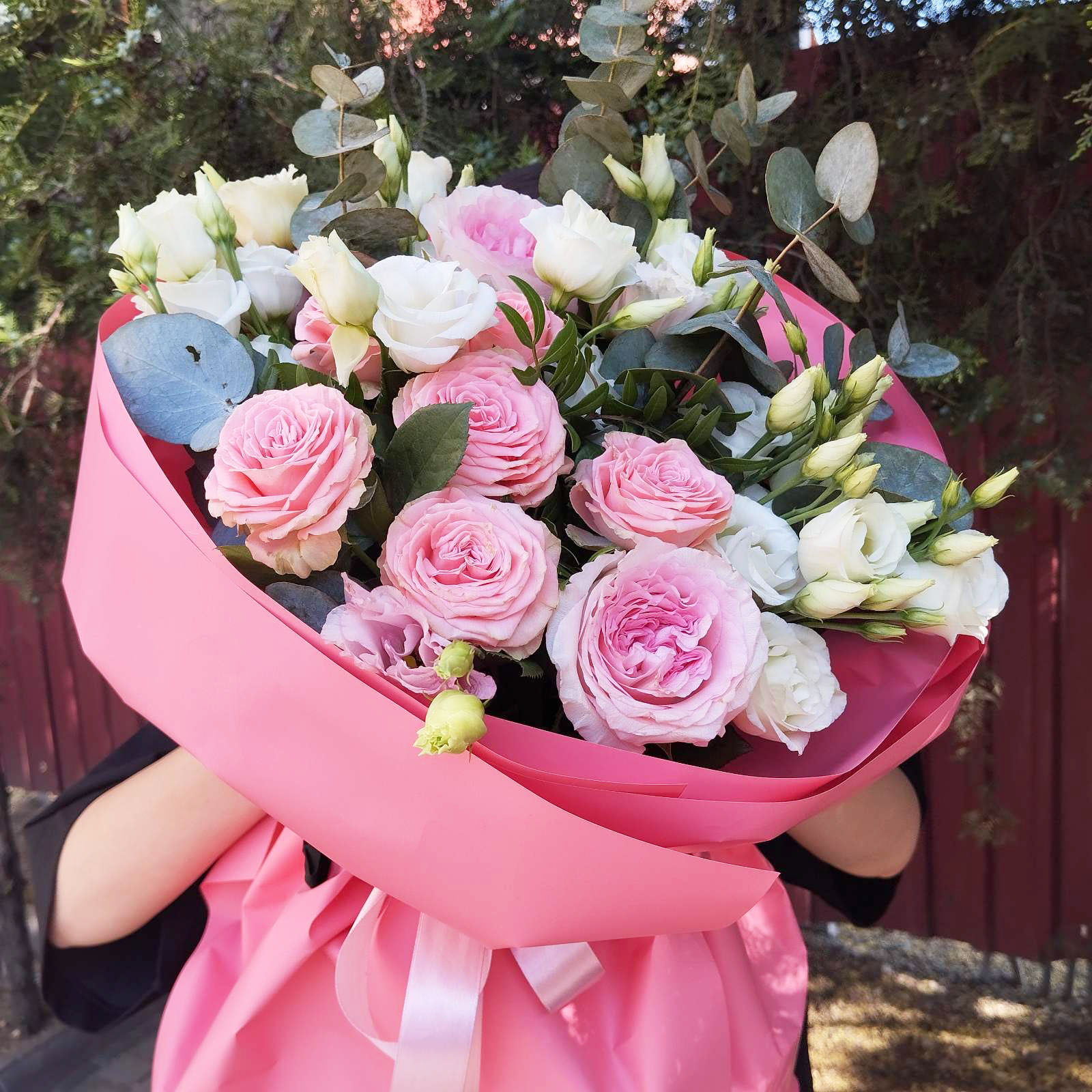 17 x branches of white, pink and lilac Eustoma 17 x pink Roses 11 x branches of the pink bush peony Roses
