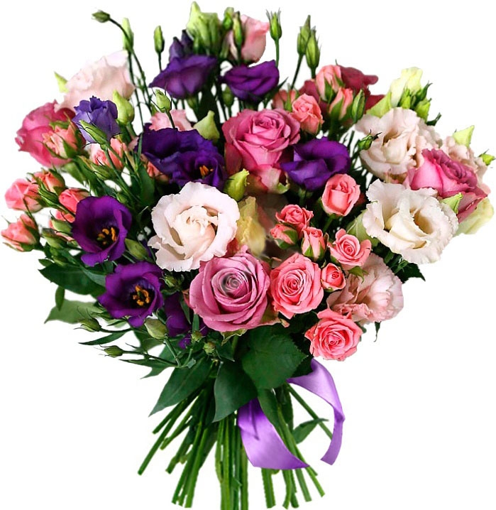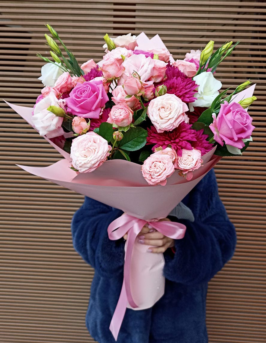 5 x branches of white, pink and lilac Eustoma 3 x pink Roses 2 x branches of the pink bush Roses