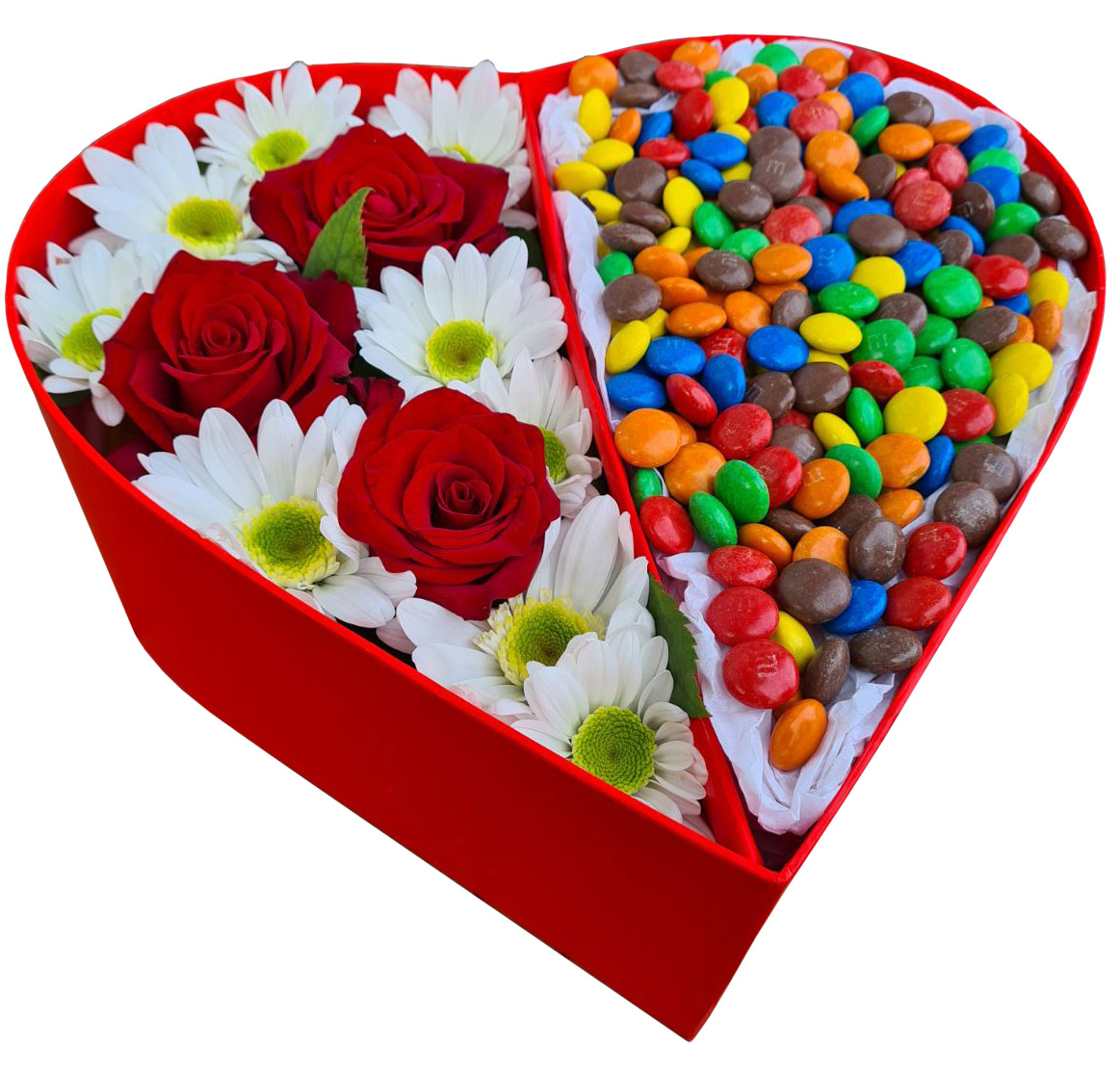 A bright and merry Gift box with red rose (s) and white chrysanthemum dasies with the second half filled with bright candy dots! Here you have green, yellow, blue, red, brown chocolate dragees bringing the atmosphere of a holiday!