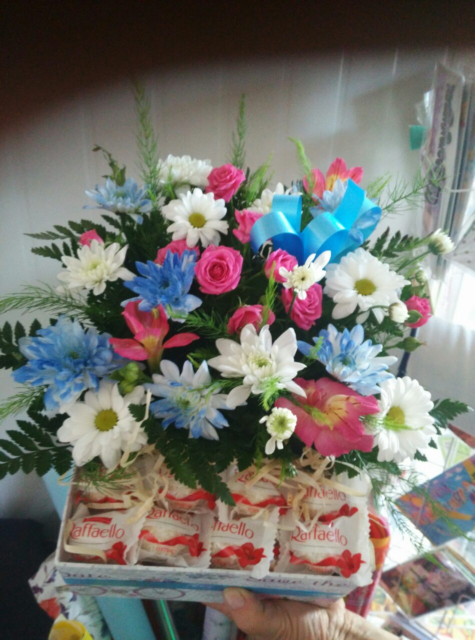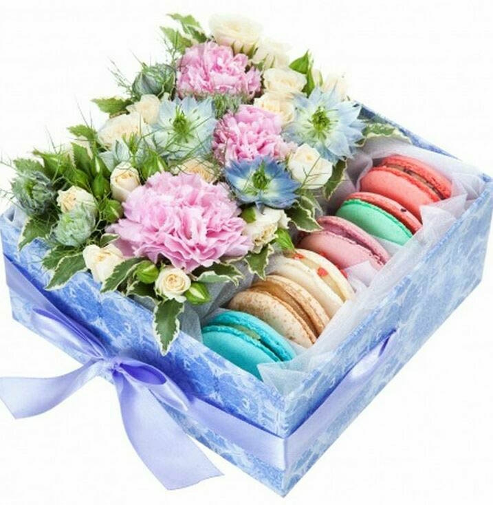 This nice gift box has flowers and incomparable makarunas - delicious French pastry.