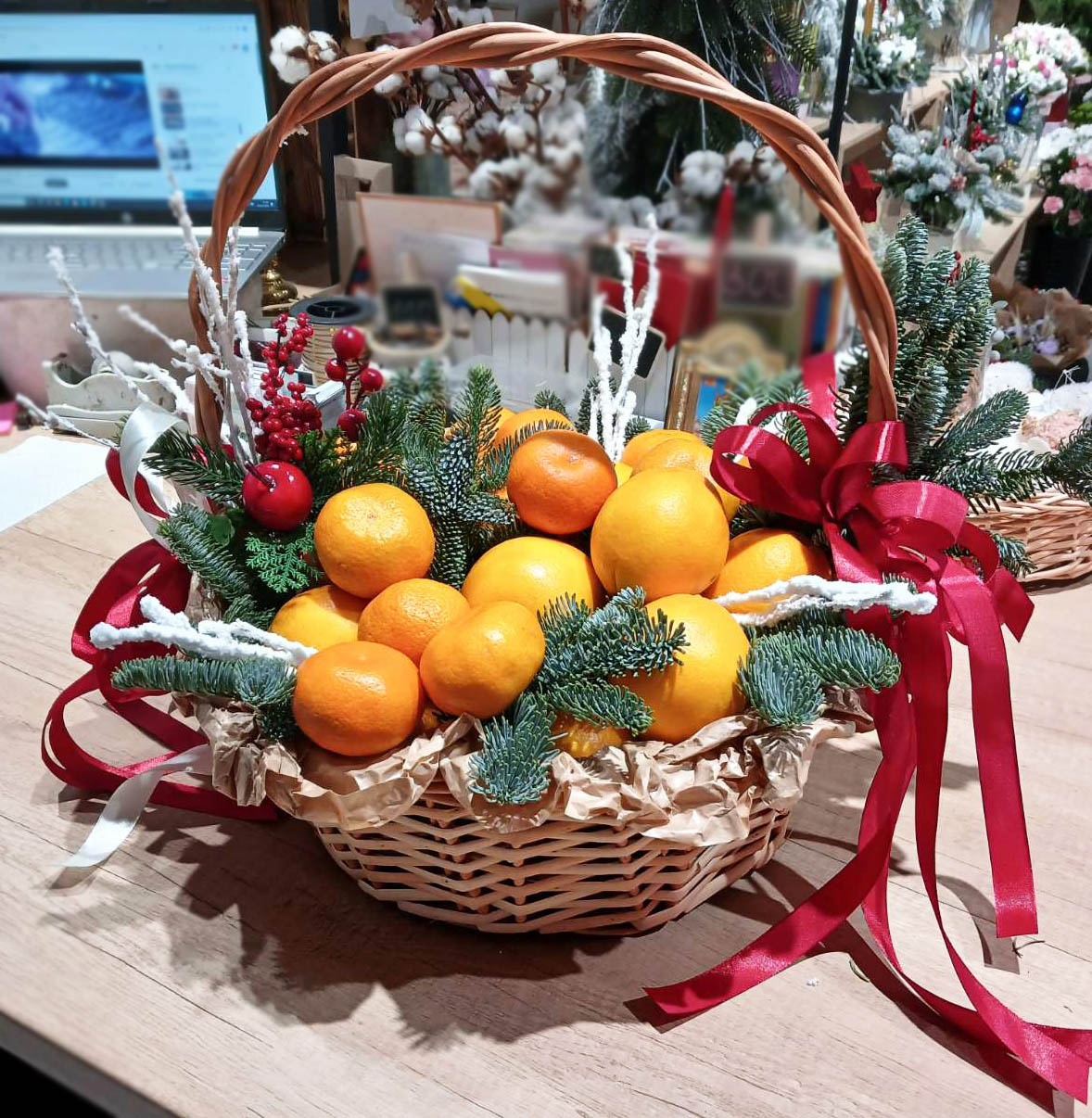 The Tangerines & Oranges Basket will be nicely designed per our florist's choice. It can be flowers, bows, nice packing, etc. If it is sent for the New Year or Christmas - decoration will be chosen accordingly to this specific and loved Holiday.