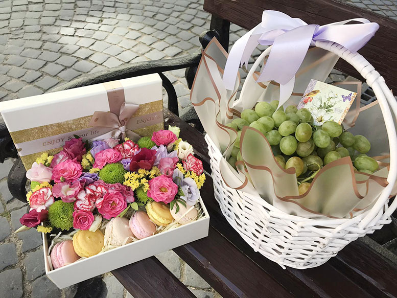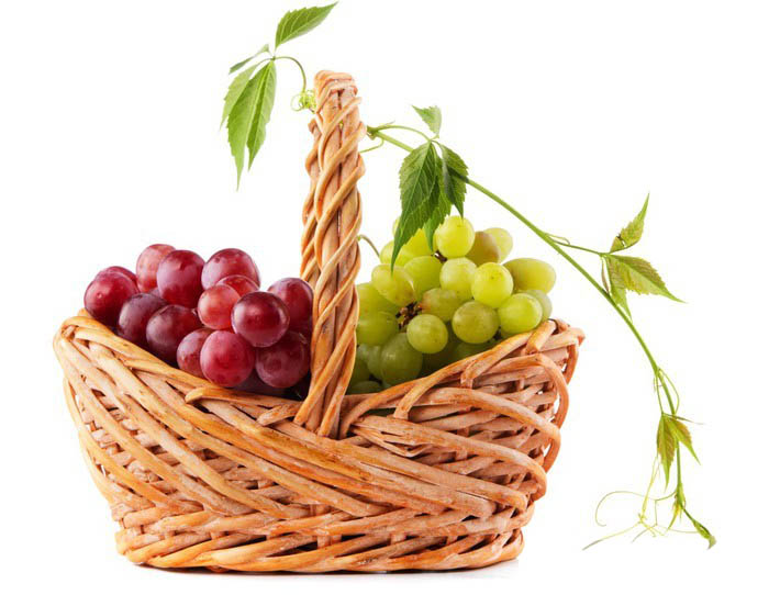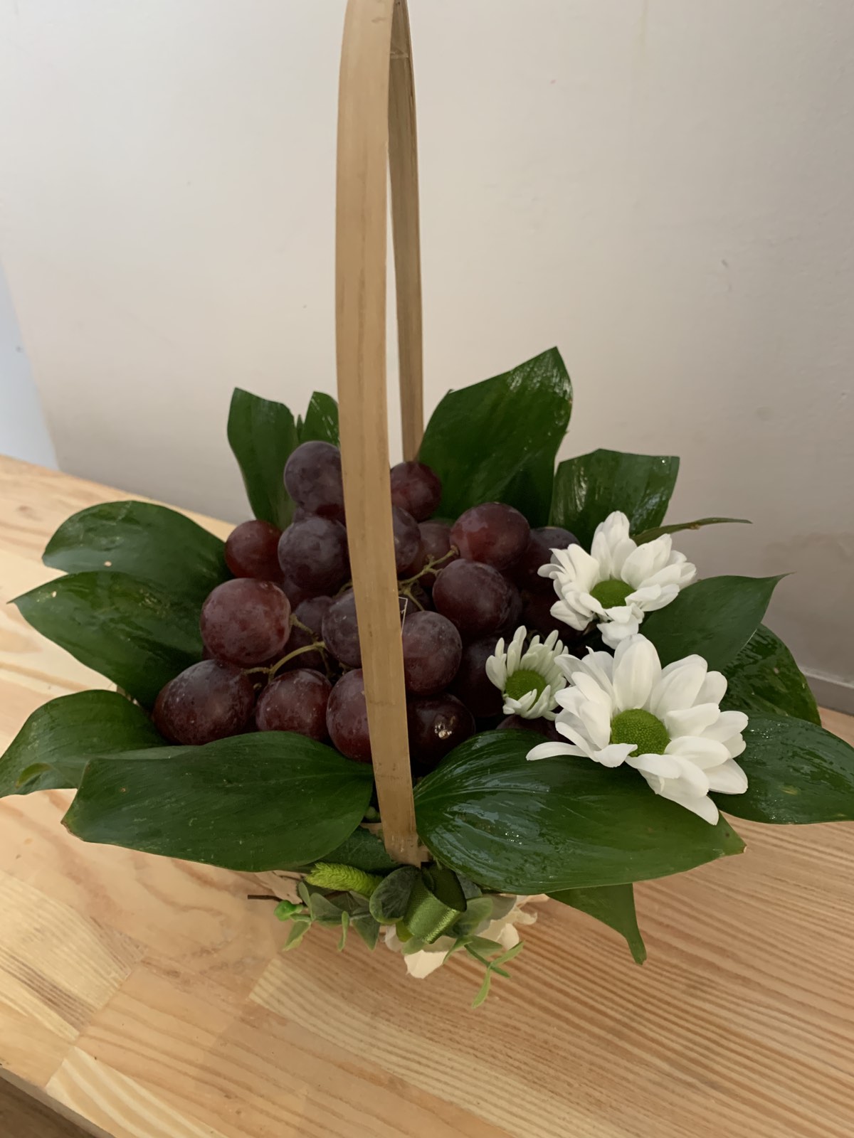 The grapes at this basket can be of a various sort and a color. We are a flower shop and will visit a supermarket to buy the grapes that are available at the moment.