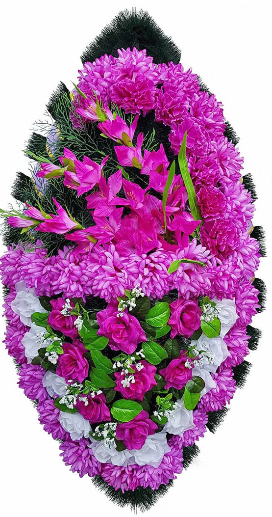 Funeral ritual wreath, made mainly purple or purple and white artificial flowers.