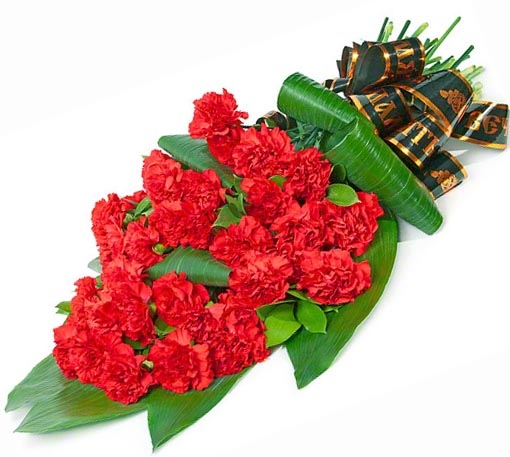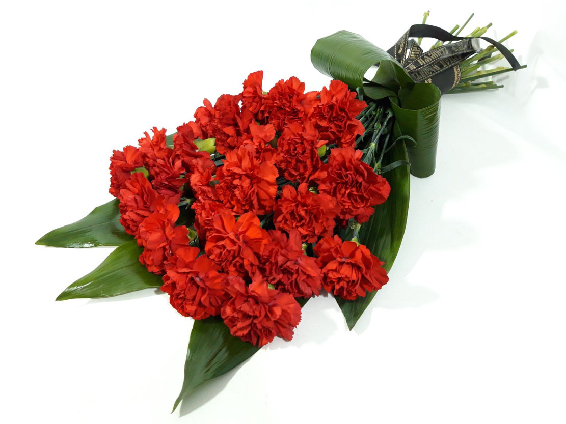Mourning bouquet with the traditional for this sad reason red carnations and aspidistra leavs.