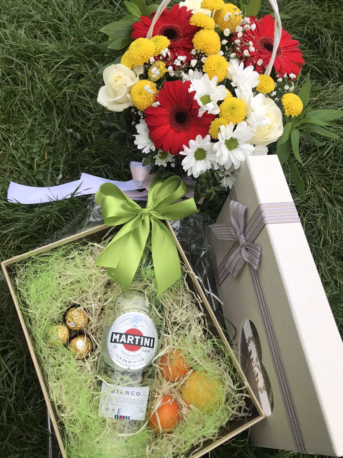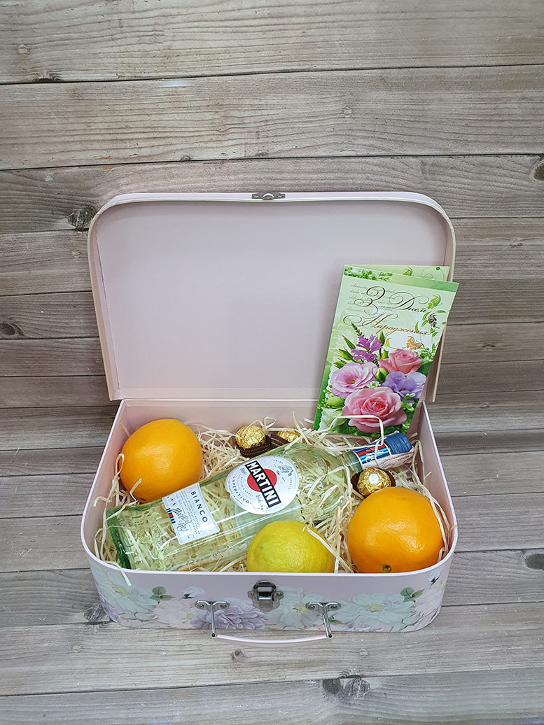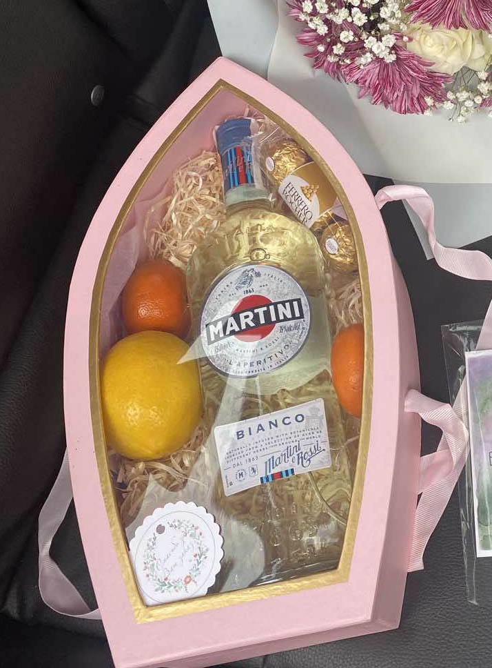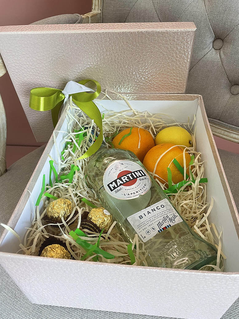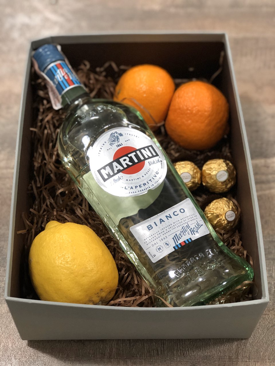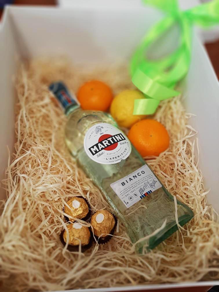 1 x Bottle of Martini Bianko 0,75 l 3 x Ferrero Rocher candies 1 x lemon 2 x mandarins or orangers gift box, decoration.