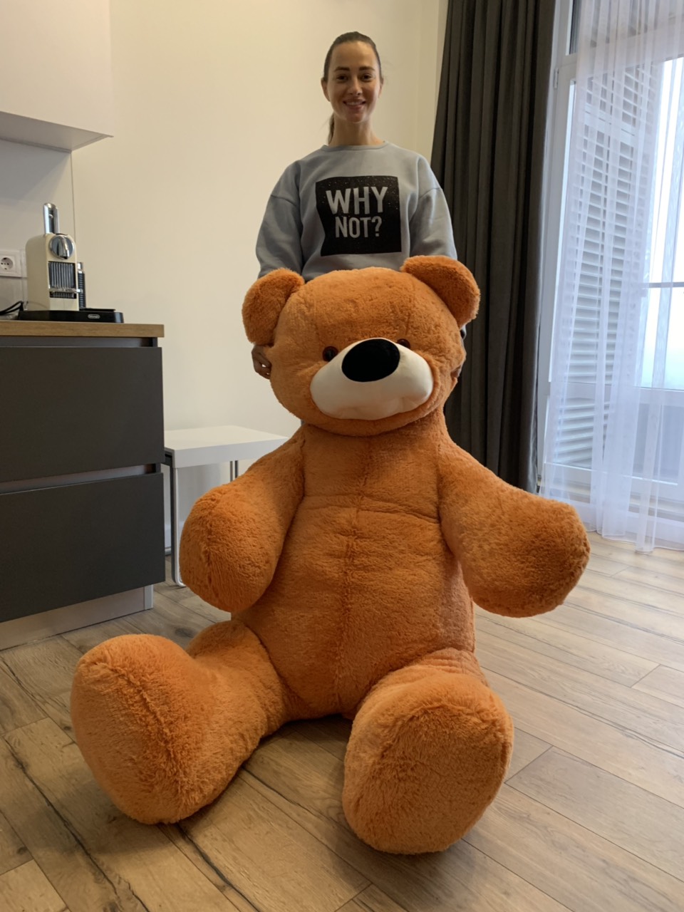 On the photo you can see and compare the size of the Teddy to a girl holding it.