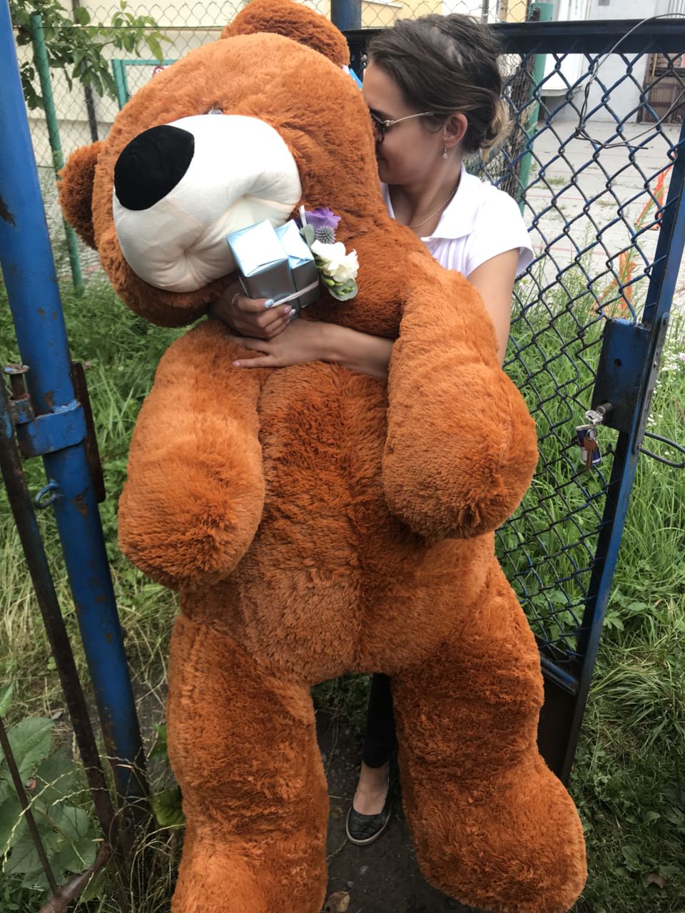 On the photo you can see and compare the size of the Teddy to a girl holding it.