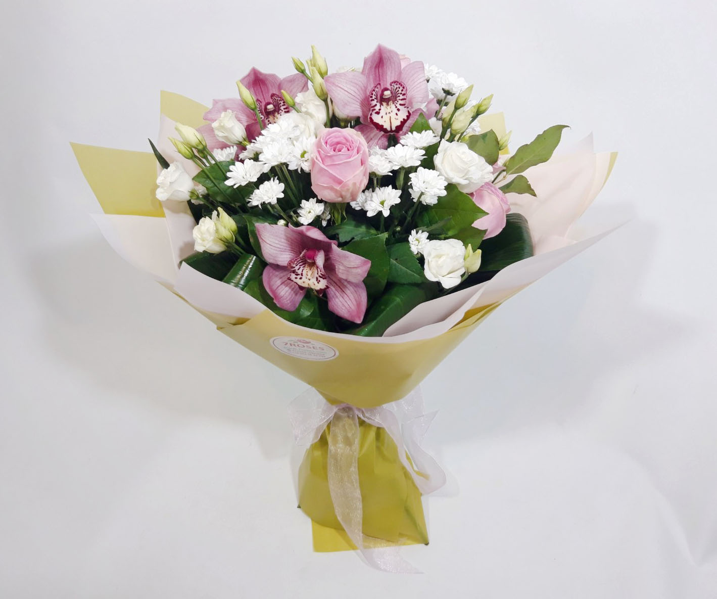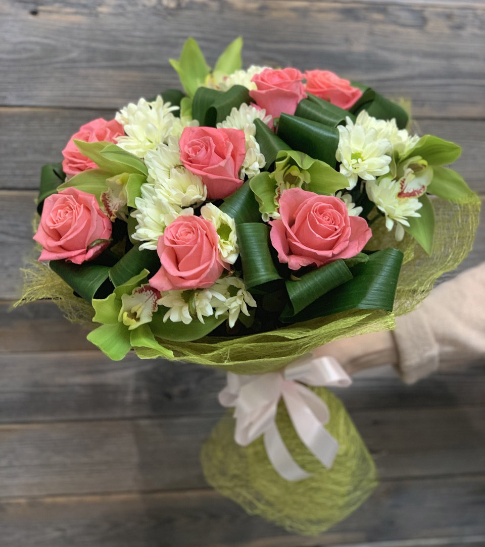 This bouquet consists of 3 orchids which stems are put in so-called capsules so that to keep them fresh for a long time, up to a month! This bouquet also includes 7 pink roses and 5 white chrysanthemums.