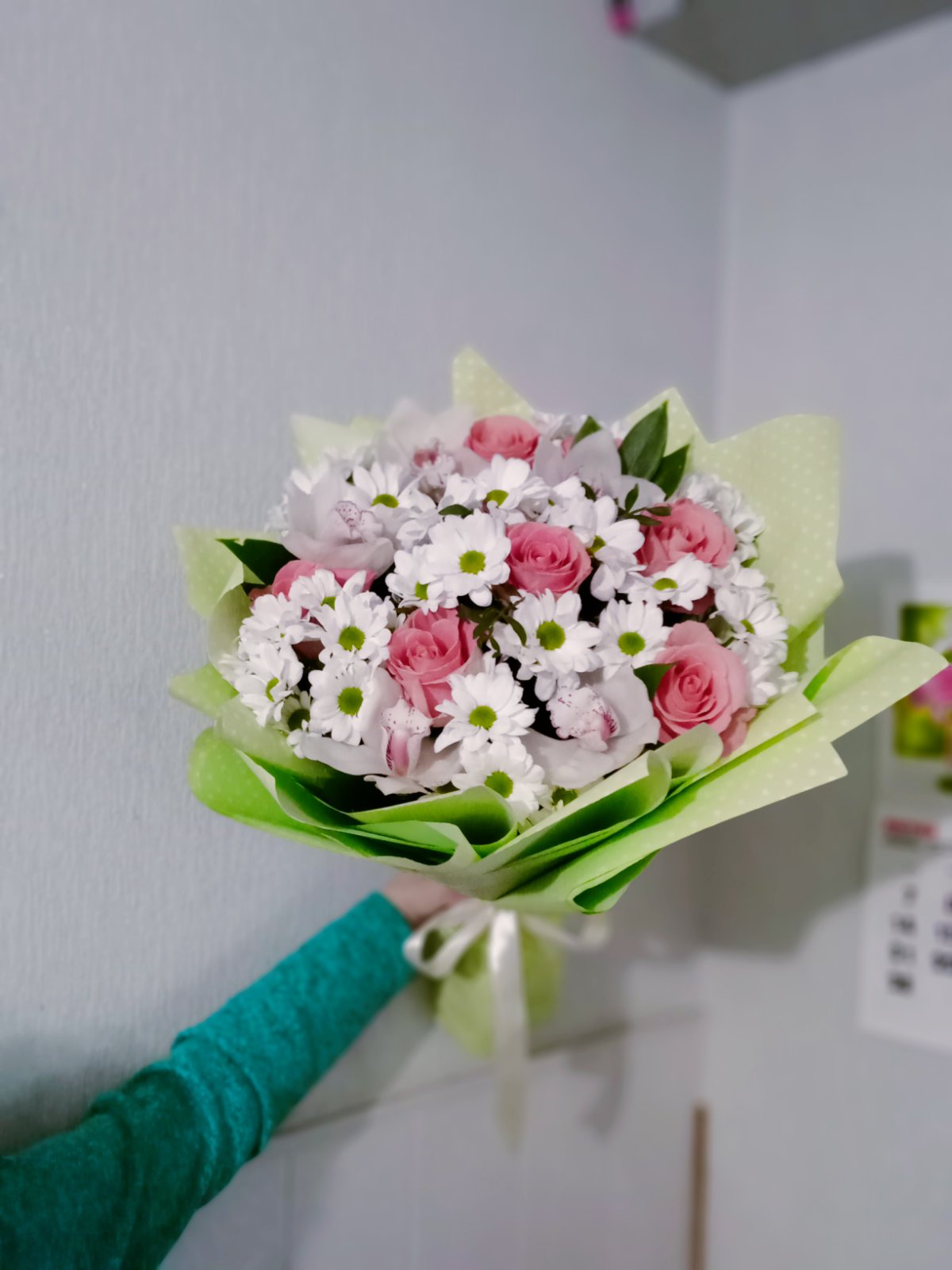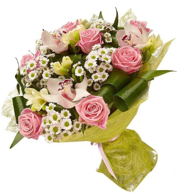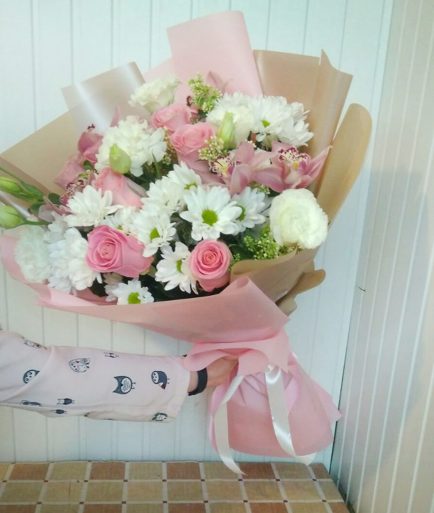 3 x White or Pink Orchids 7 x Pink roses 5 x White chrysanthemums
