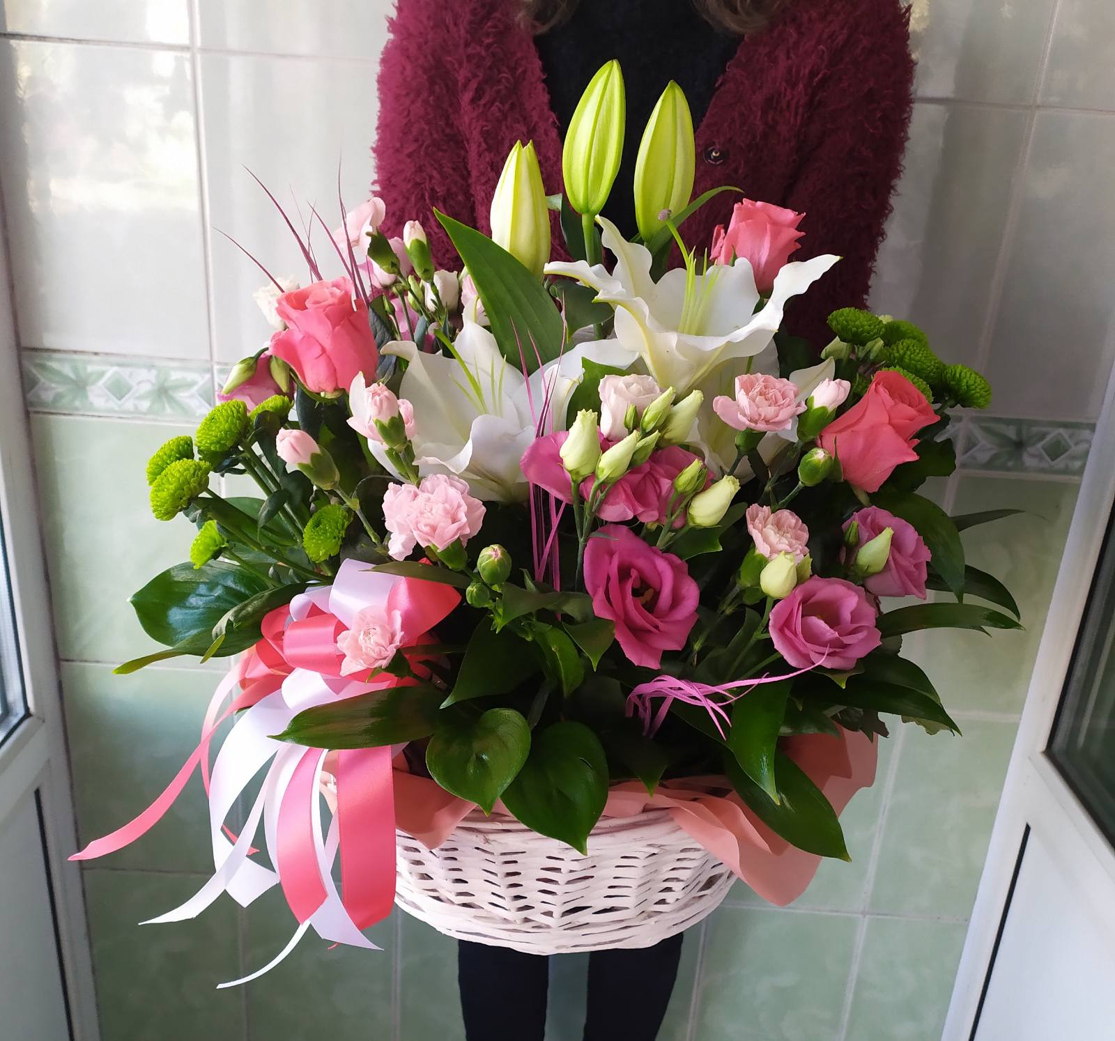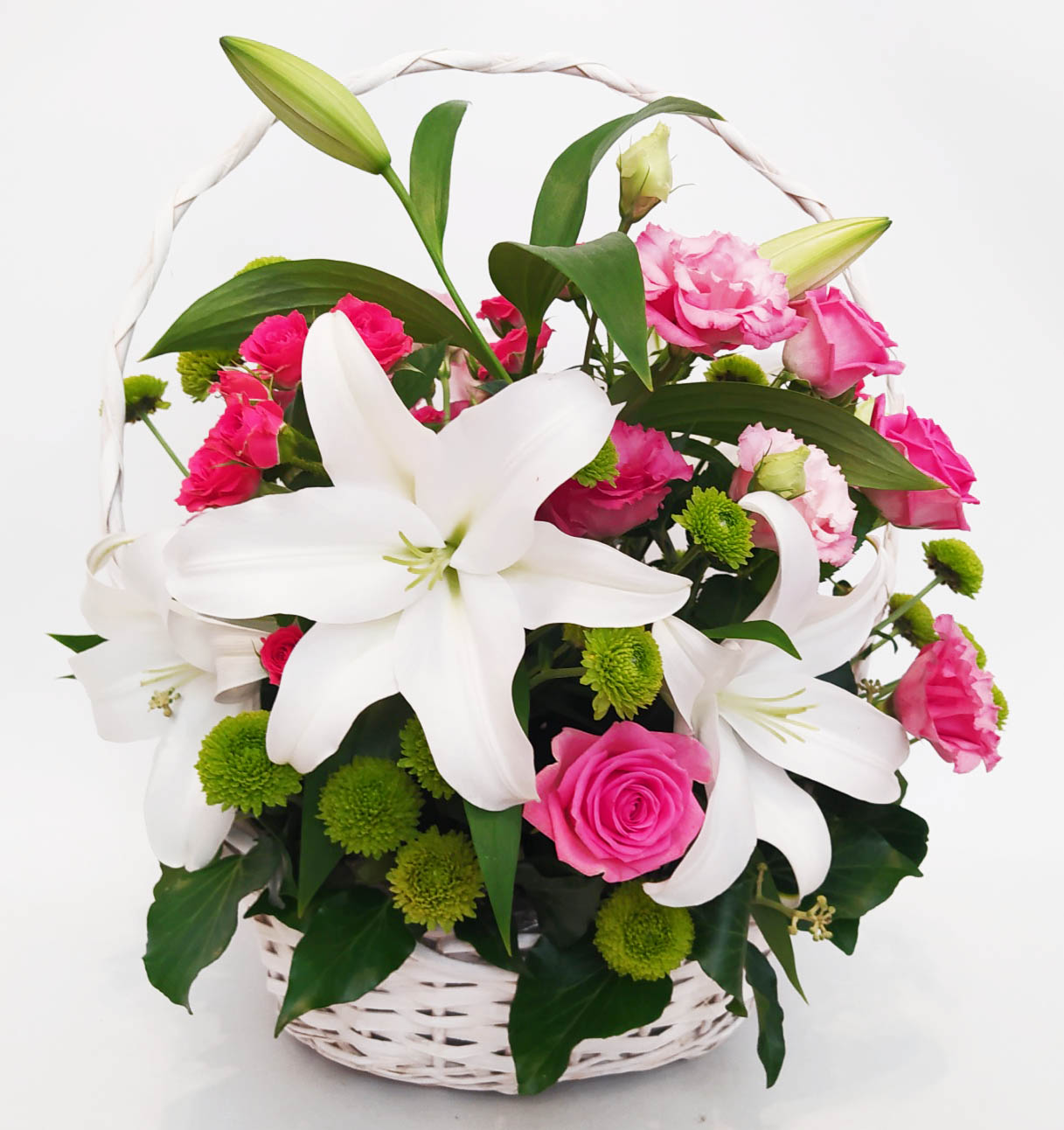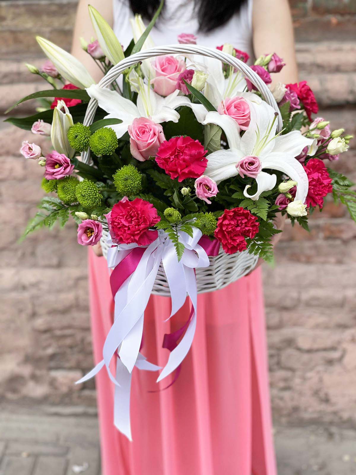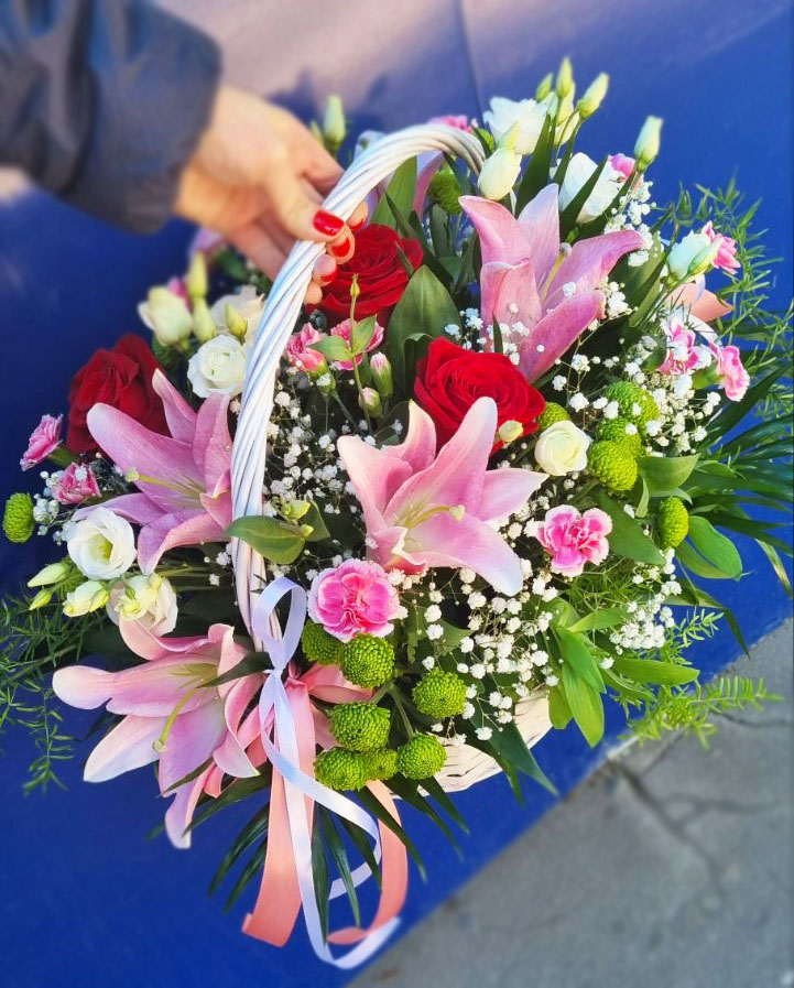 Magnificent cold beauty of lily is warming by a pink roses, carnationss and refreshing by a violet eustoma flowers. They are presented on a shadow of green chrysanthemums, arranged at a basket.