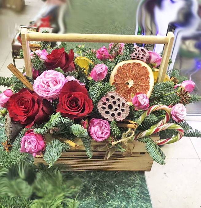 Composition is arranged at a wooden box like at our picture, or at the gift box, or at the basket (depends on the boxes selection at our flower shop at the moment)
