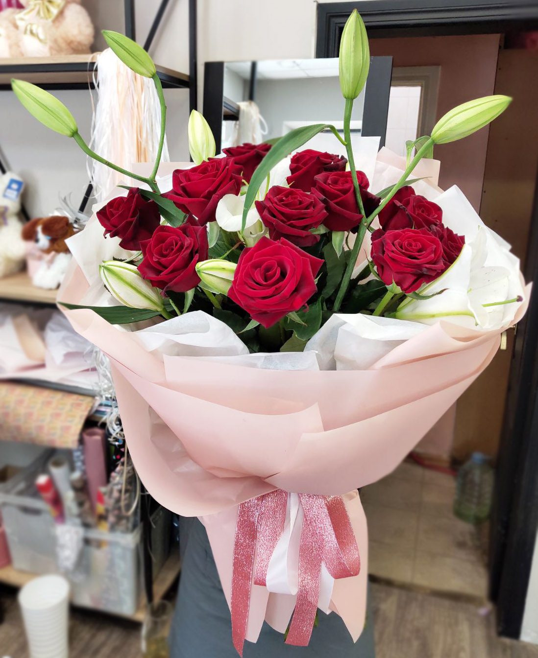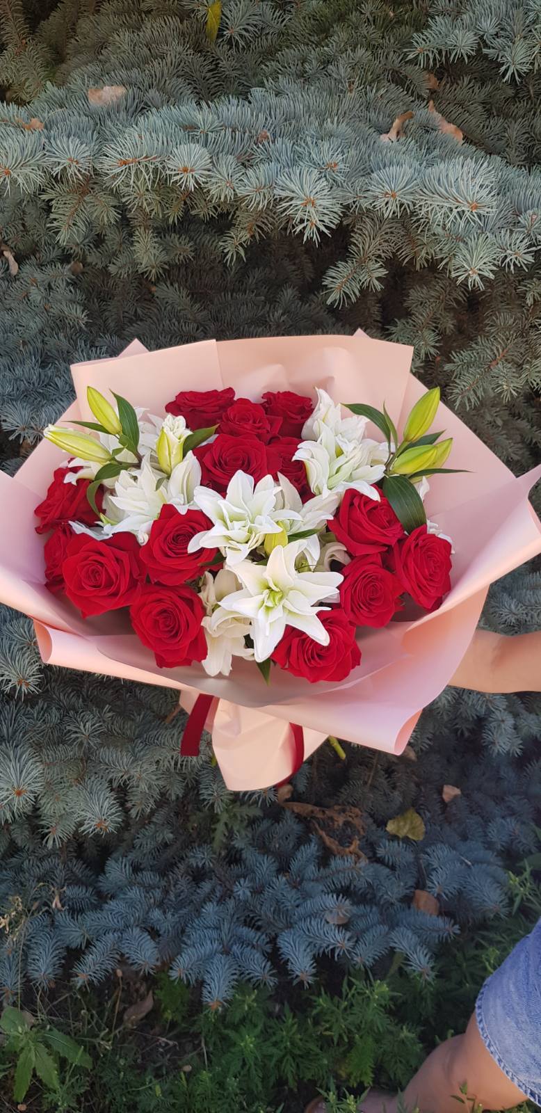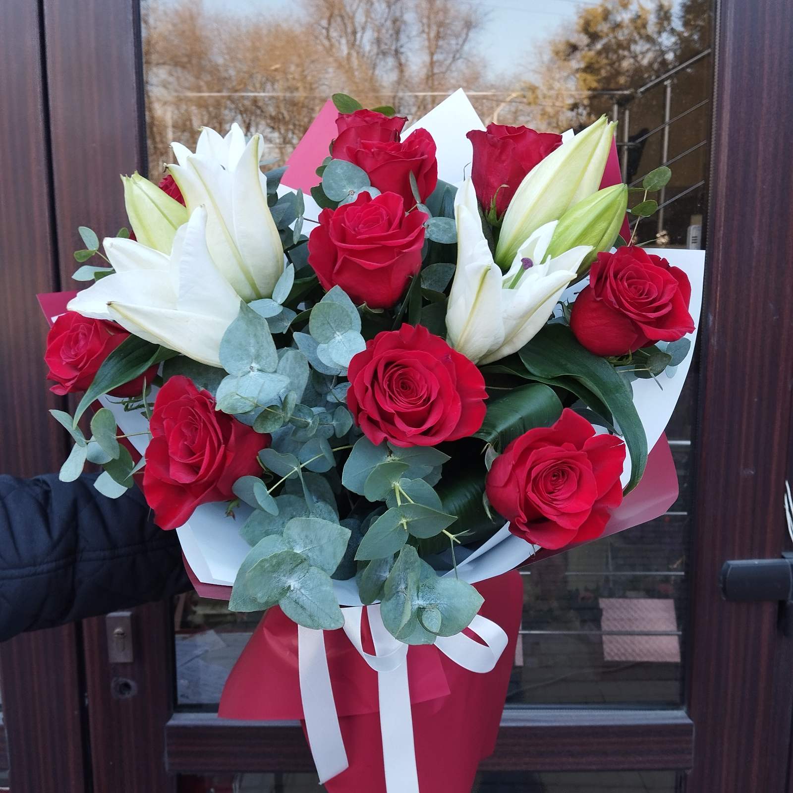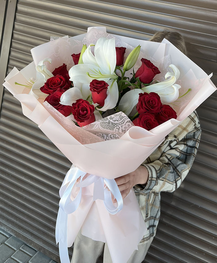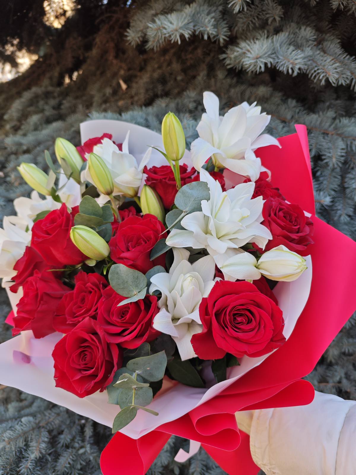 A pure tenderness of a white lily and red rose like a sweet morning kiss of a beautiful seemly maiden.
