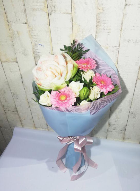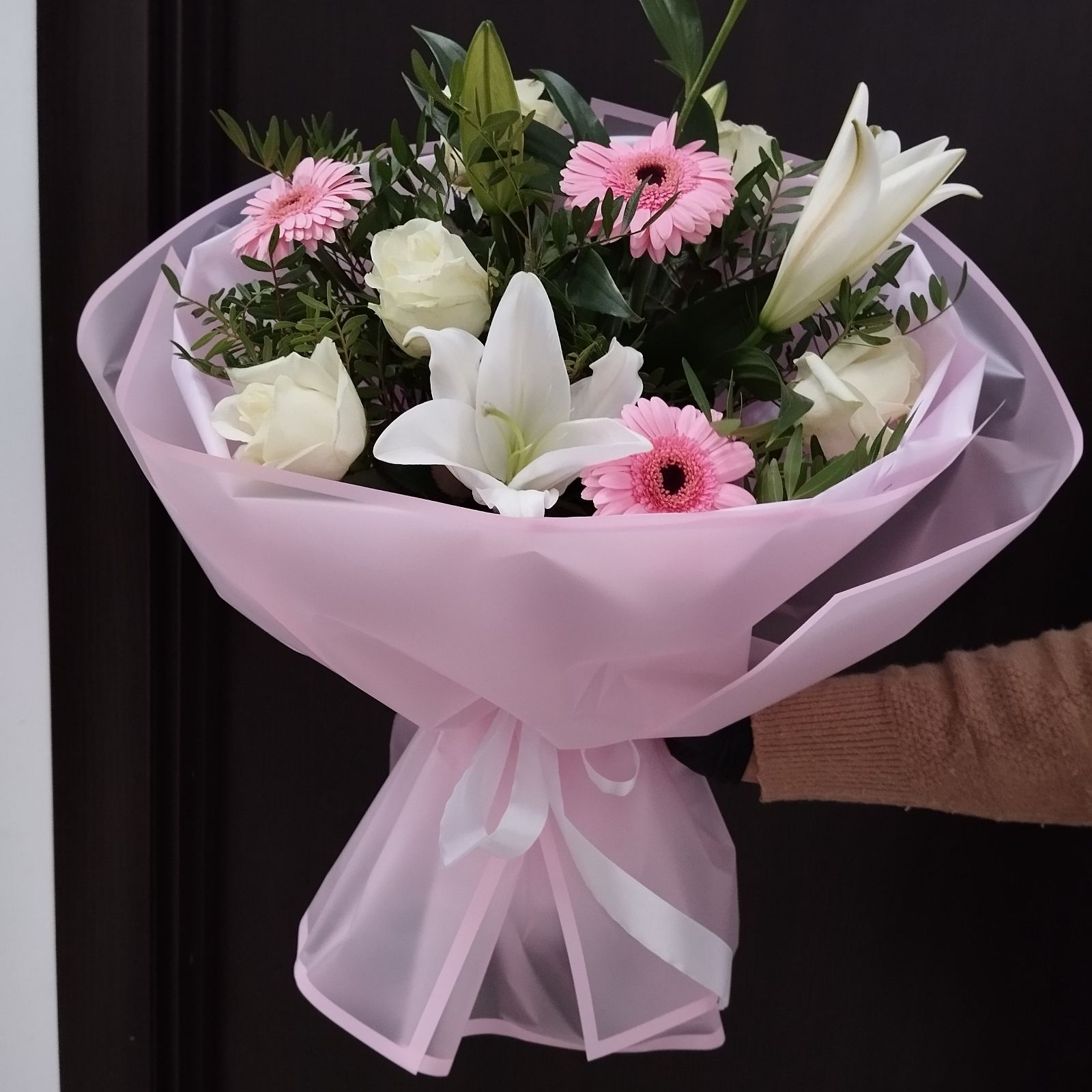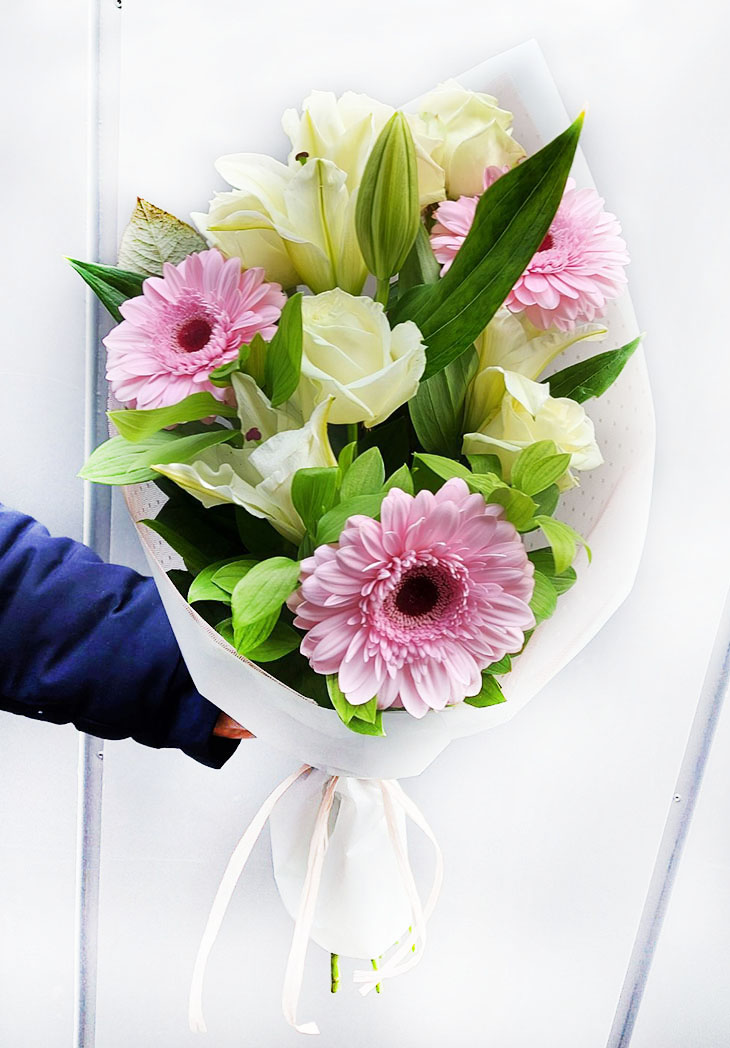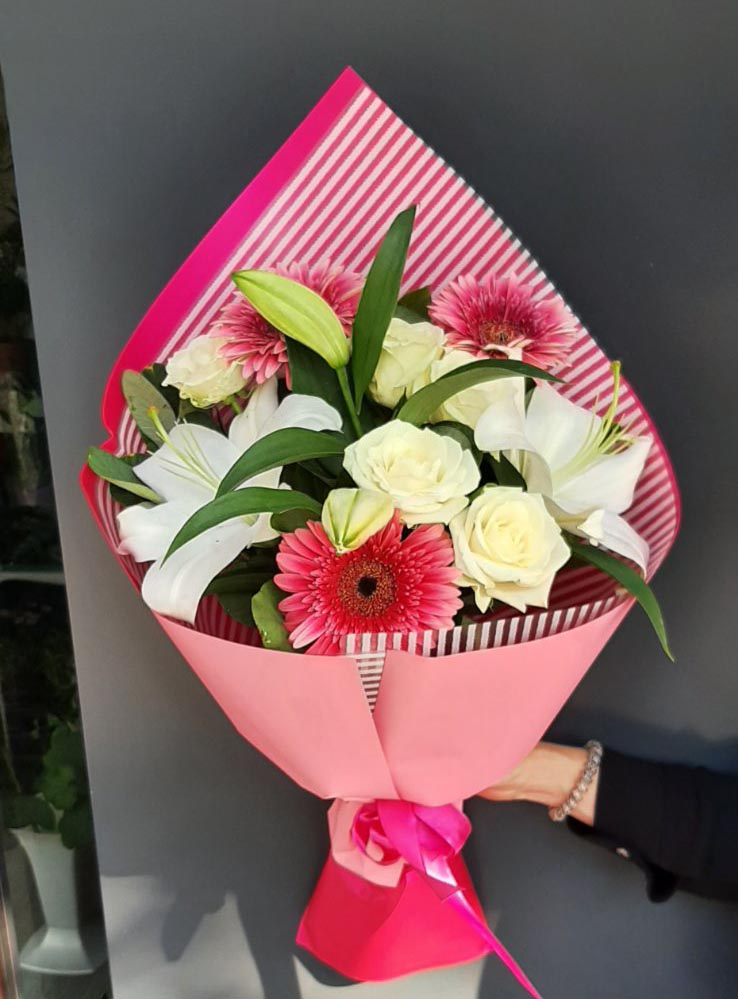 An elegant pink-pastel color bouquet of lilium, 5 roses, 3 pink gerberas or pink roses.