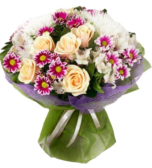 - 3 cream color or white roses (per the availability at the moment) - 3 chrysanthemums (white and pink) - 3 alstromerias