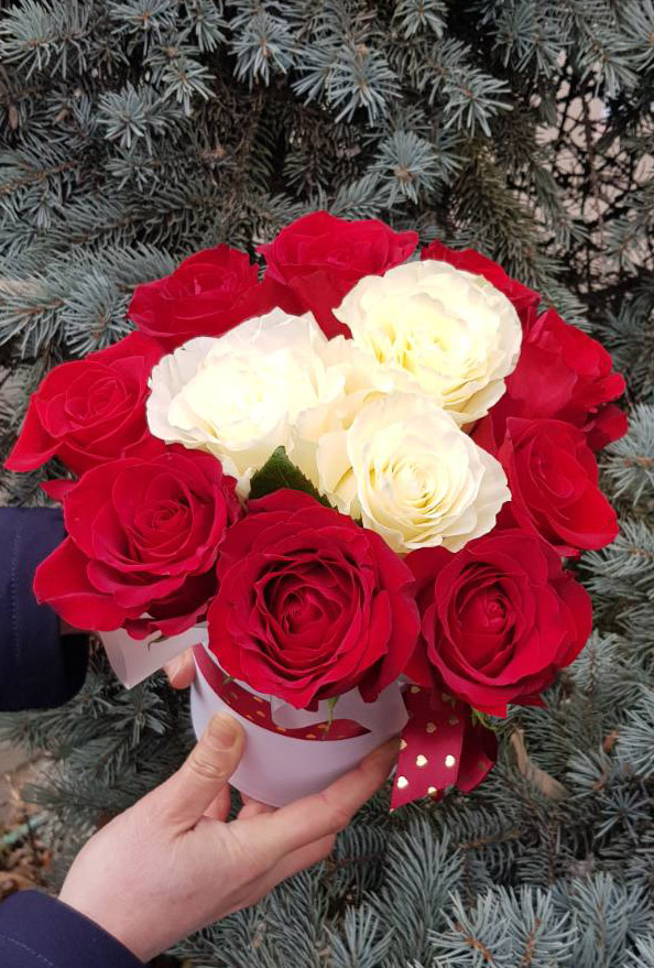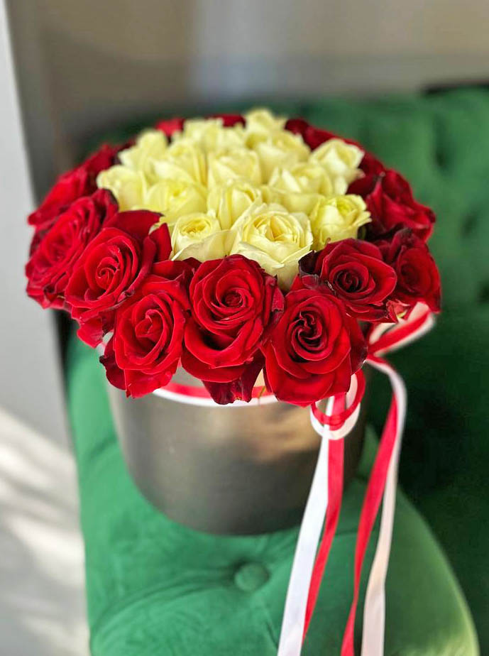 Our photo shows 25 Red & White roses (total number) arrangement, but you can choose another size.