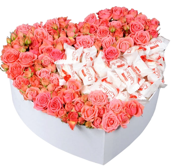 A charming arrangement of pink spray roses and tender Rafaello candies that are loved by any one!!