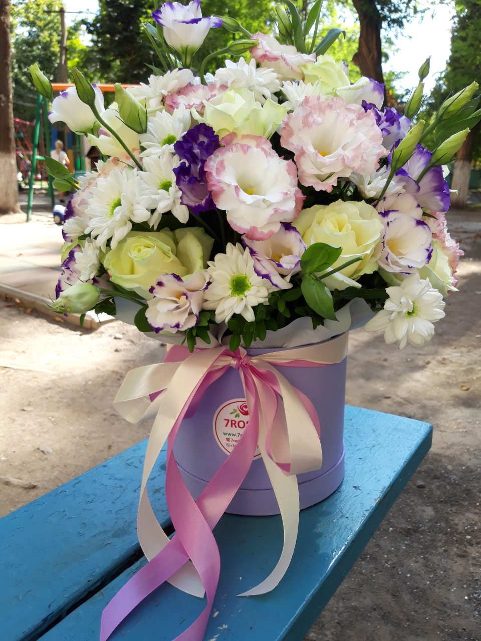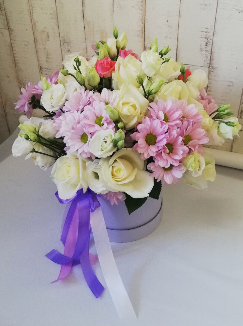 A Hat Box flower arrangement in pink, lilac and white tones at a hat-box looks really impressive.