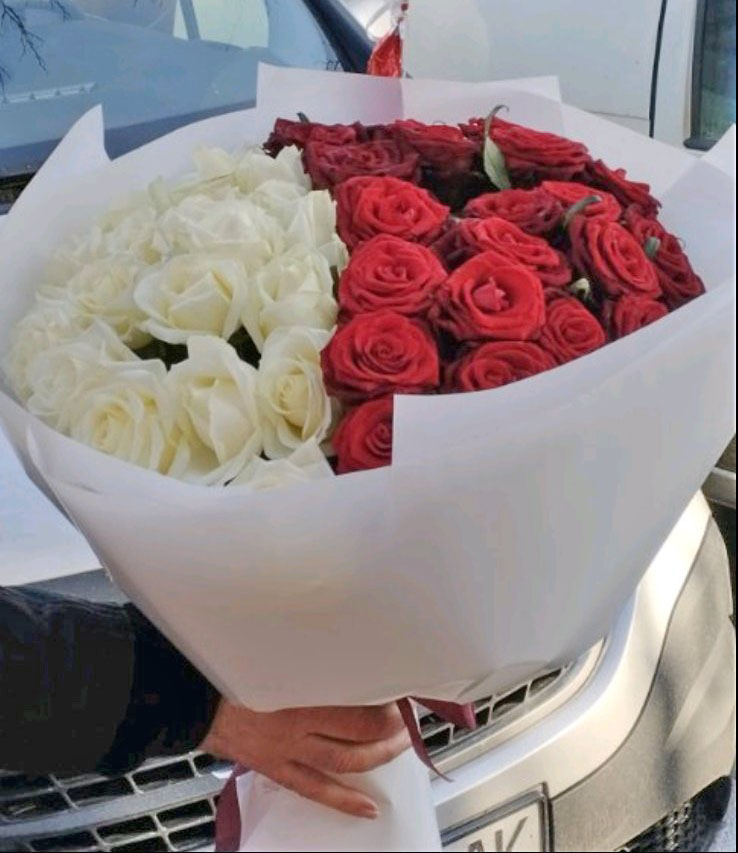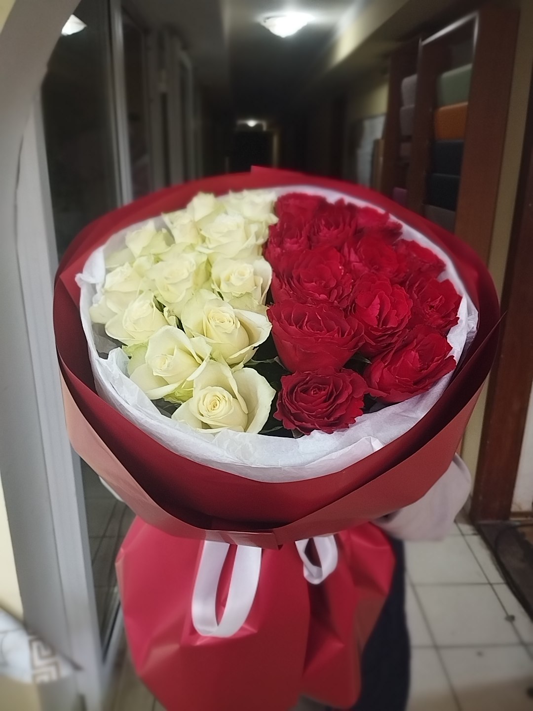 Needless to say that this bouquet design looks the more impressive the more roses it includes. That's why we start from 25 roses total. The bouquet at our photo has 151 roses.