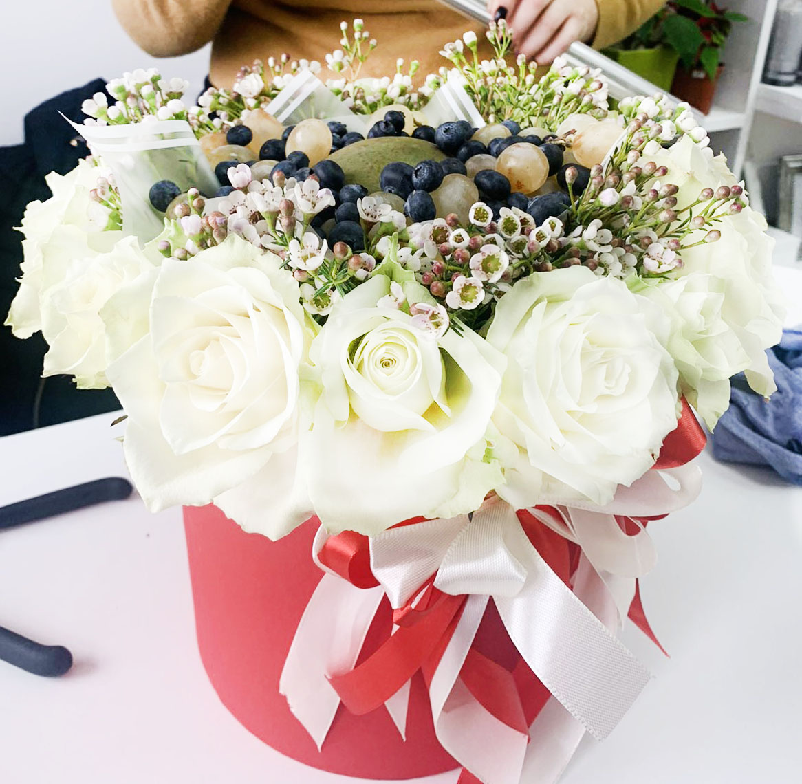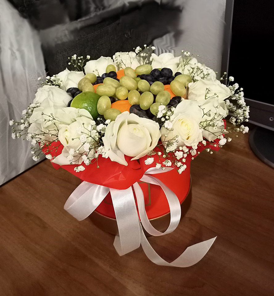 Our photo shows arrangement of 19 white roses with a set of mixed fruits and berries. However the size of the arrangement can be both bigger or smaller.