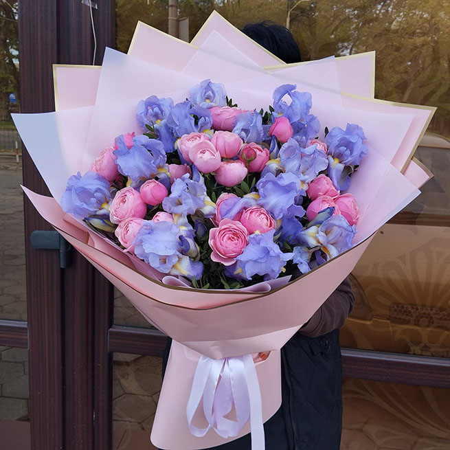 Original combination of pink and blue color flowers.... It can be either irises in a spring season like it is sjown at our photo, or blue eustoma, or... other blue or dark blue flowers that are available at the moment.