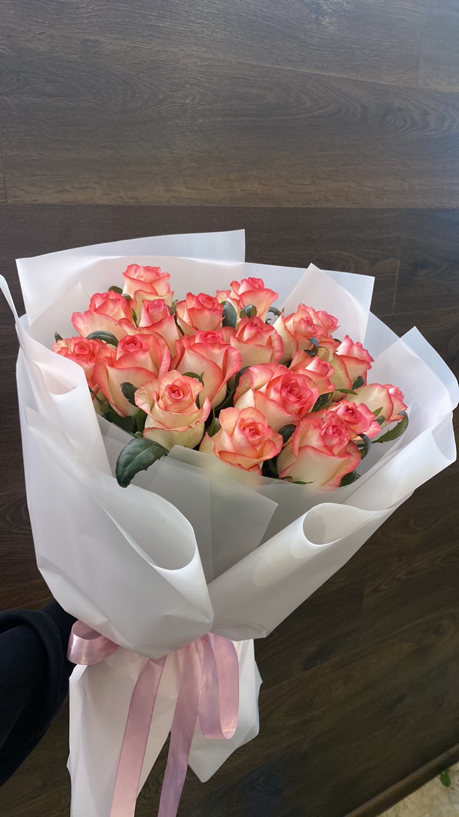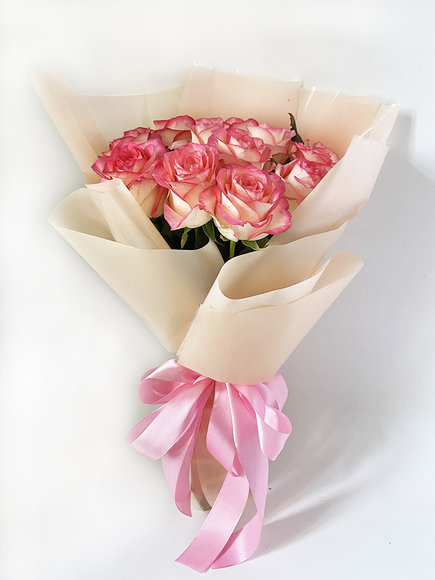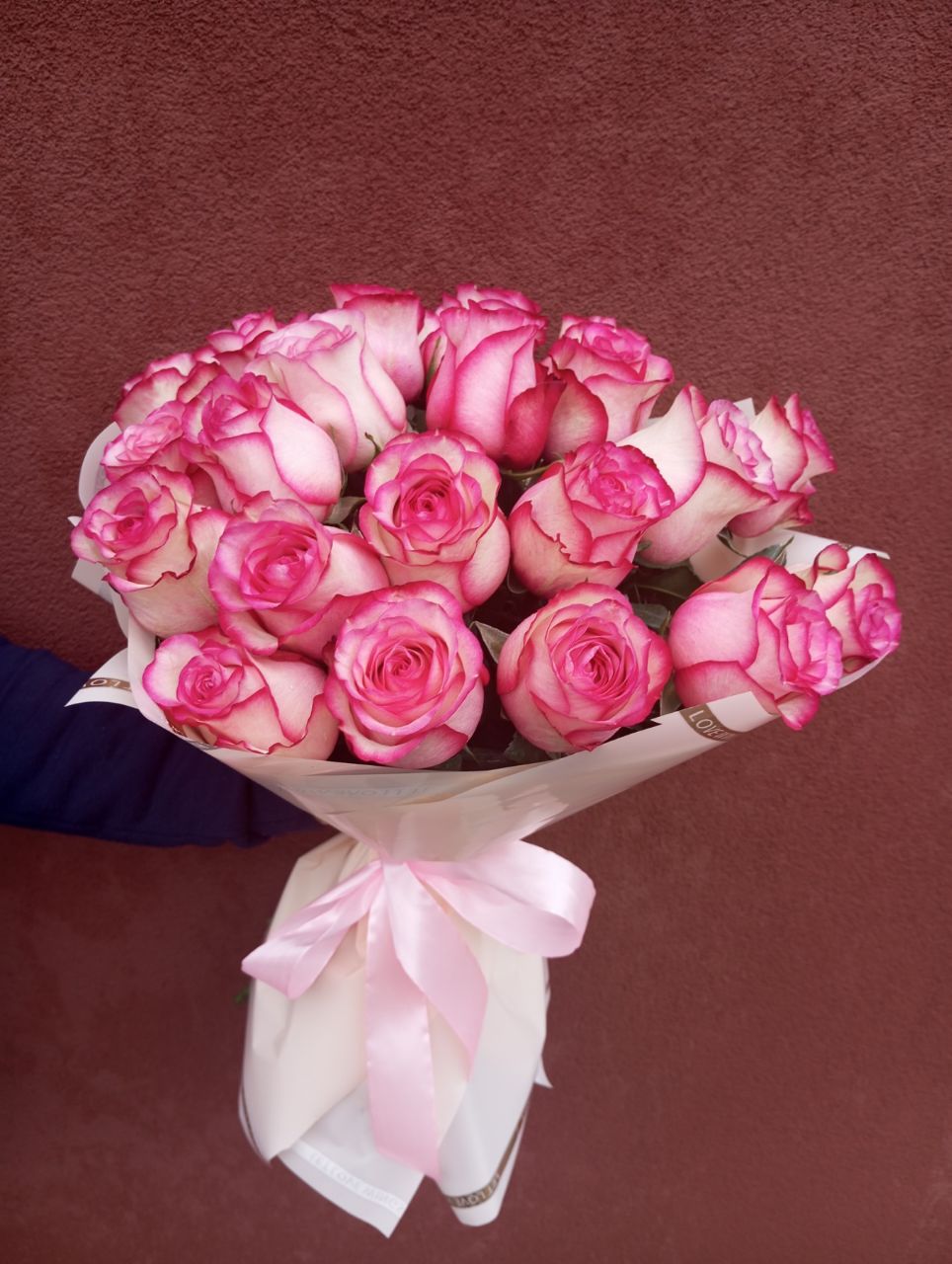 The Jumilia sort of roses is a Ukraine growing roses of a very special color. Jumilia roses buds are snow-white with a delicate pink border on each petal. This combination creates an incredibly delicate impression of the whole bouquet. Take a look at one of our additional photos that shes Jumilia bud in detail.