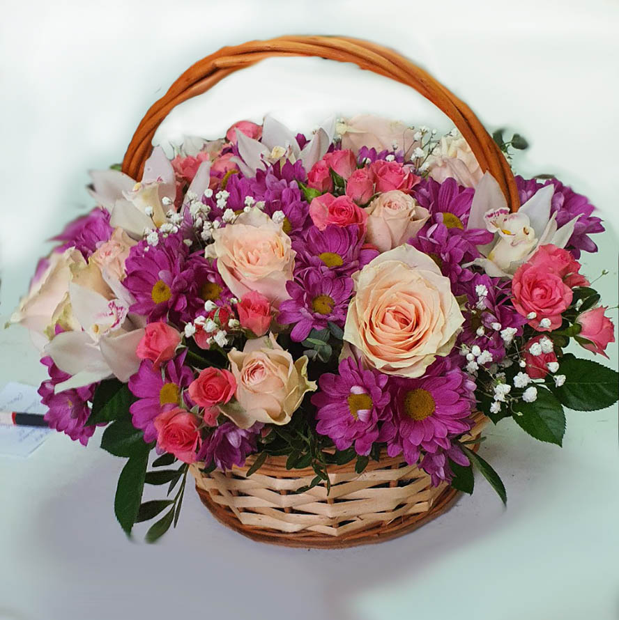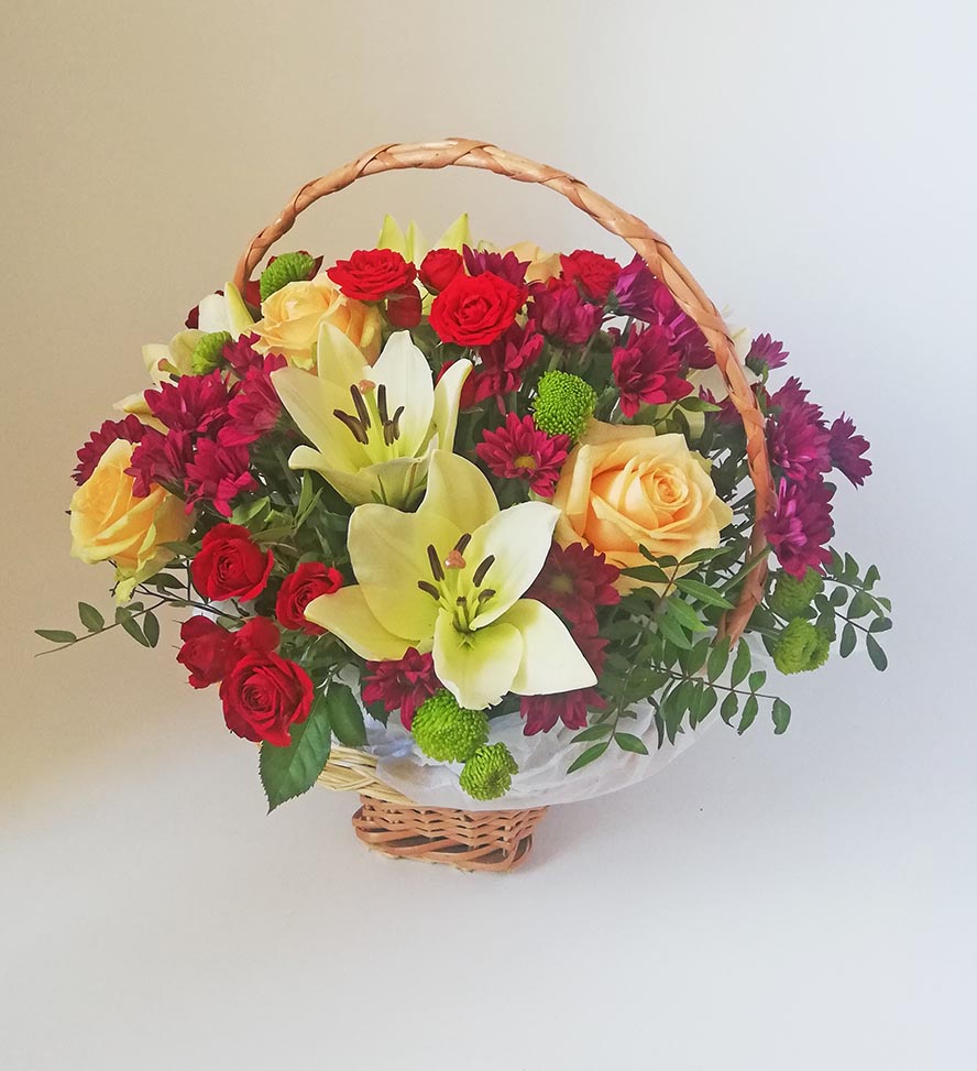 Arrangement can be made at a basket like it is shown at our main photo, but can be composed at a stylish hat box. It depends on the florist choice. Anyway it will be done as beautiful as possible.