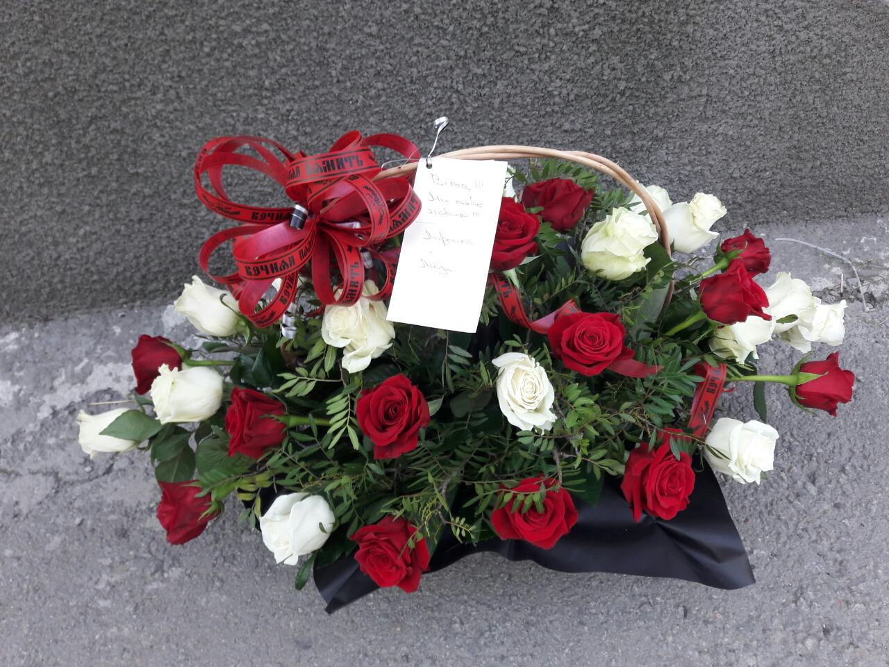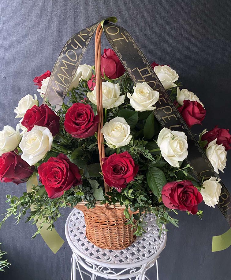 This is specific Basket arrangement with the even number of of Red and White Classic roses. Such even numbers arerangements are acceptable for memorial events only for Slavic culture .