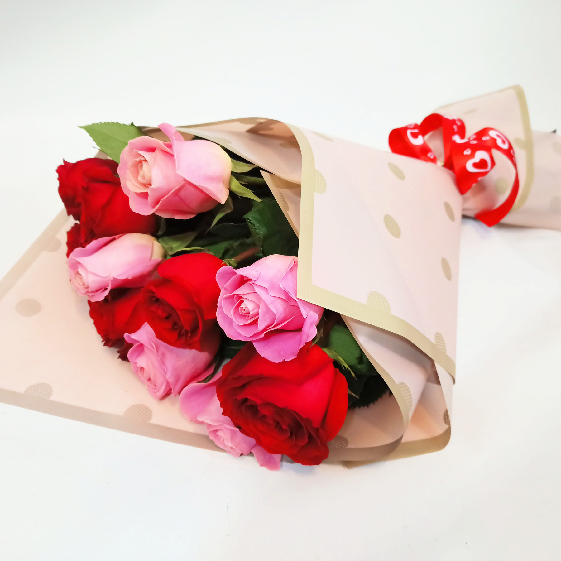 Red and Pink Classic Roses bouquet, arranged in floral paper with a satin bow.