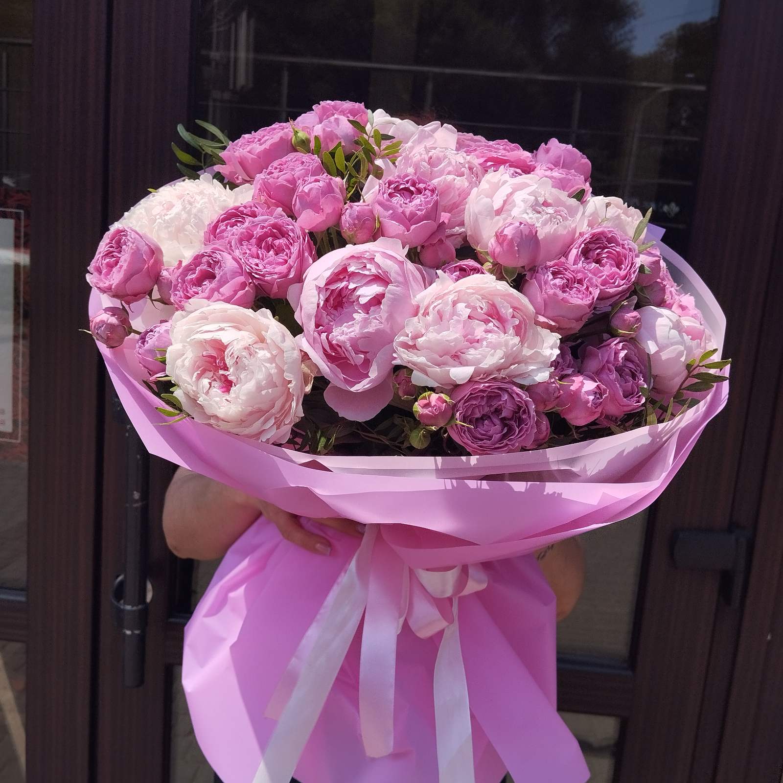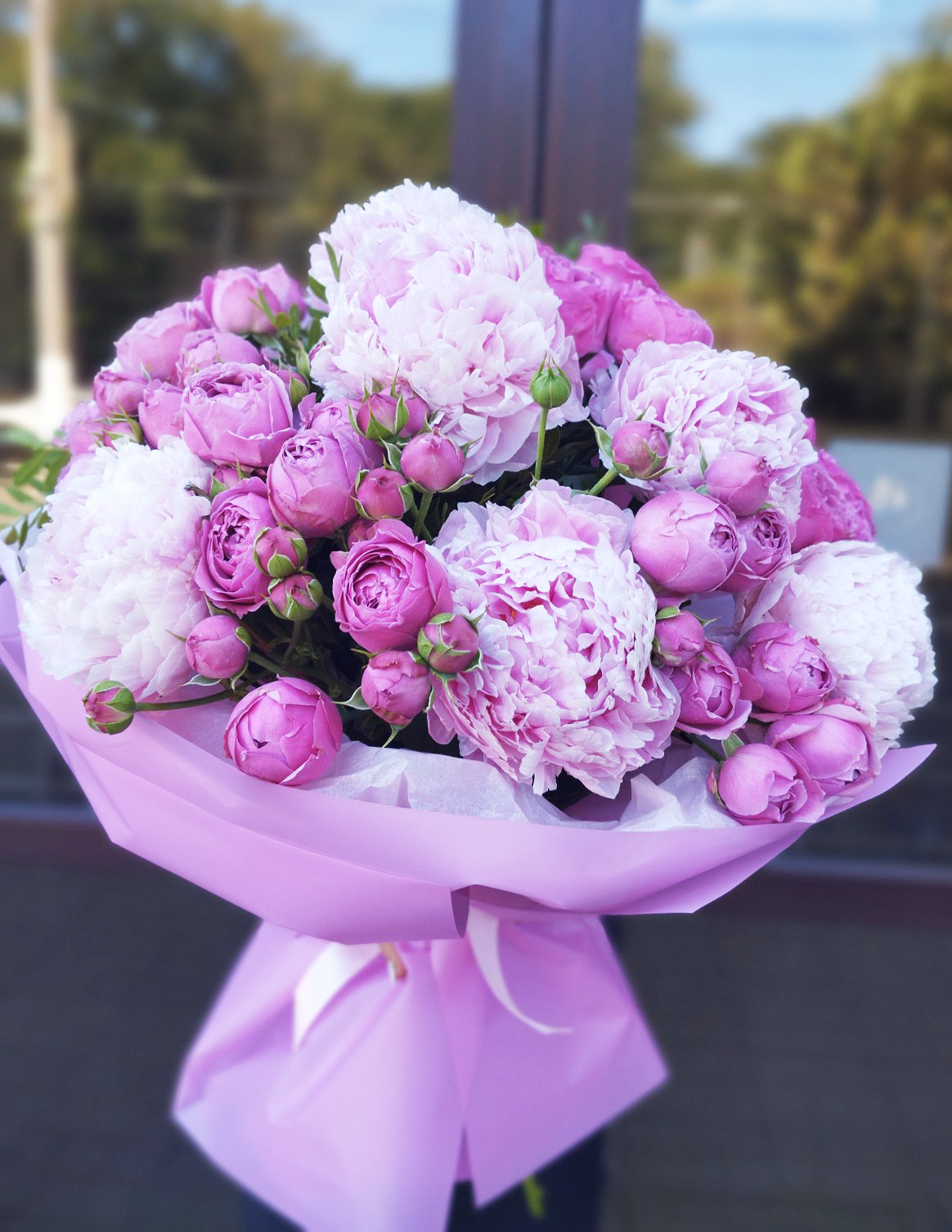 This bouquet can be delivered at a peonies blossoming season only: May - June apprx. If it is ordered at the other months, peonies could be substituted with the other nice flowers of a light pink color, such as orchids, roses, etc. Let us remind, that each stem of a spray roses has from 4 to 7 buds! They make even a "Small" bouquet looking luxury. Needless to say about the bigger options.