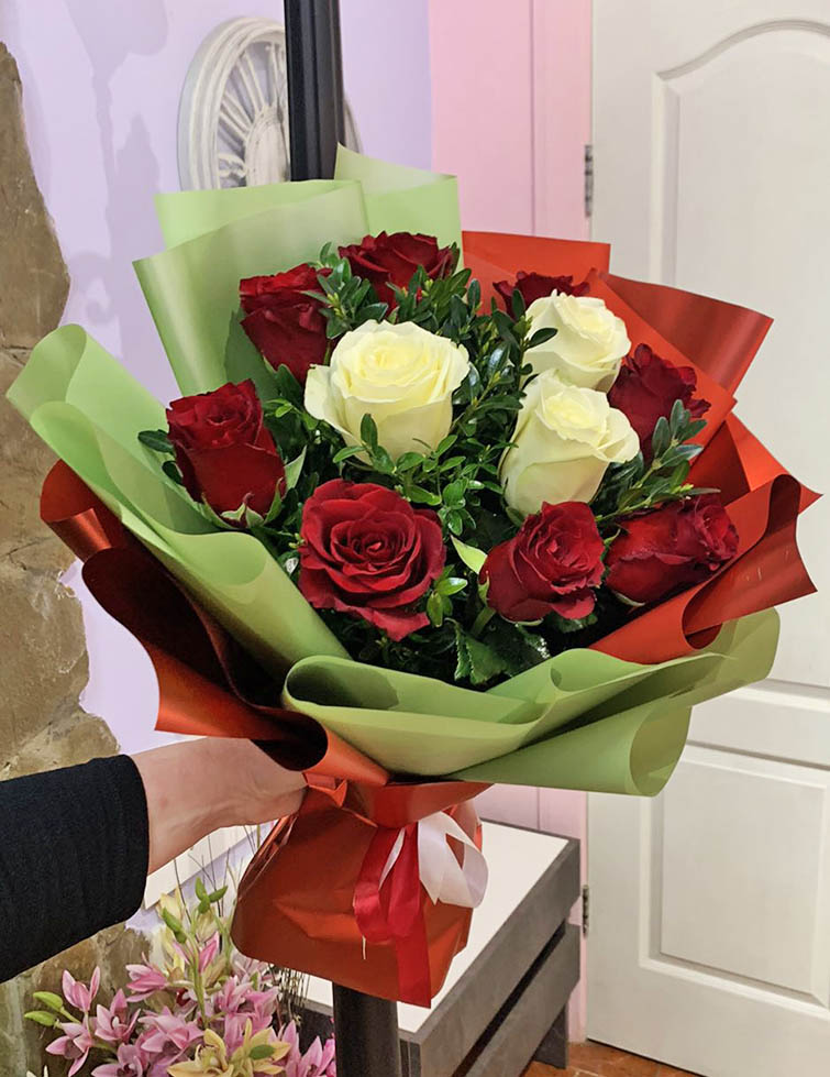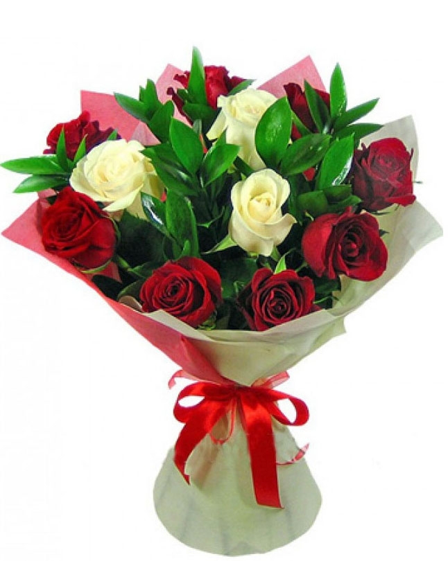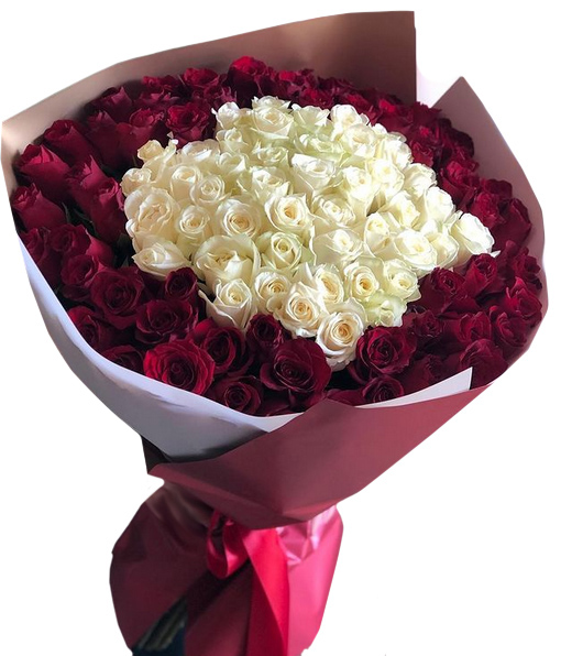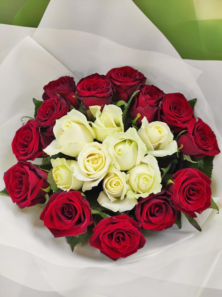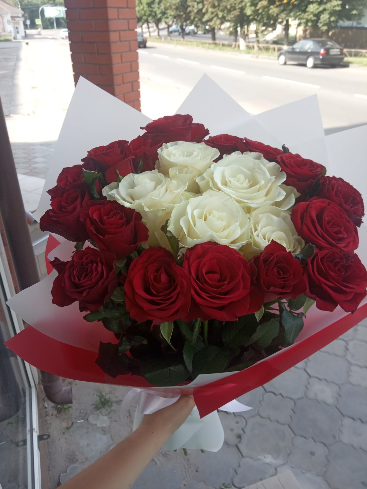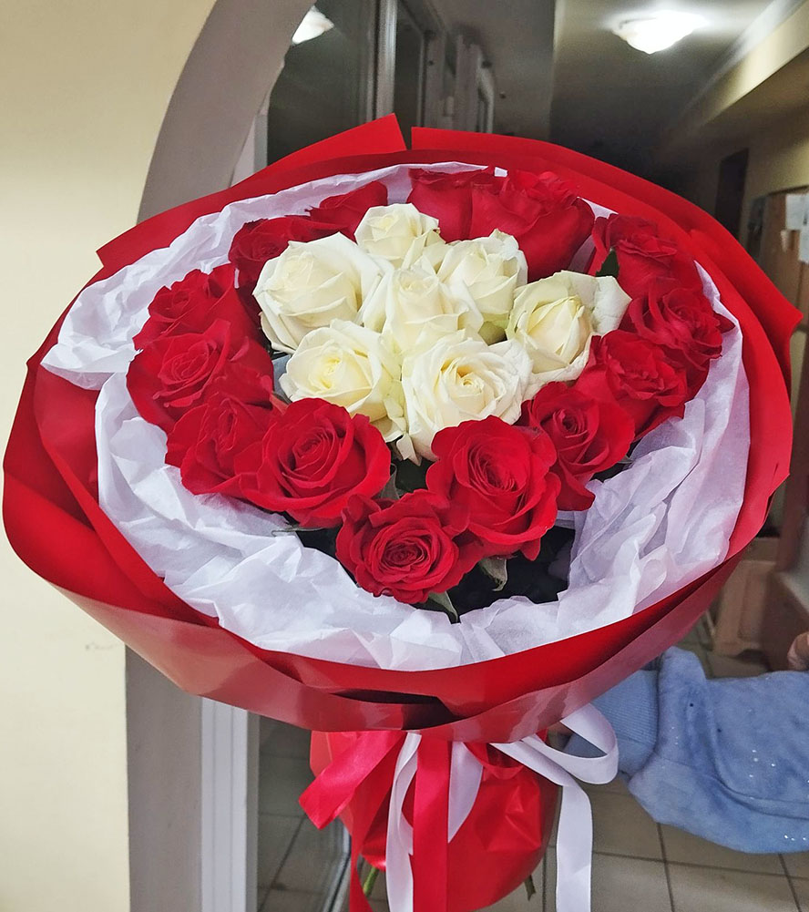 Stunning round bouquet of the Classiс Red and White roses in the center. Special original bouquet design.Decorated with greenery, foliage, nice packing and red ribbon