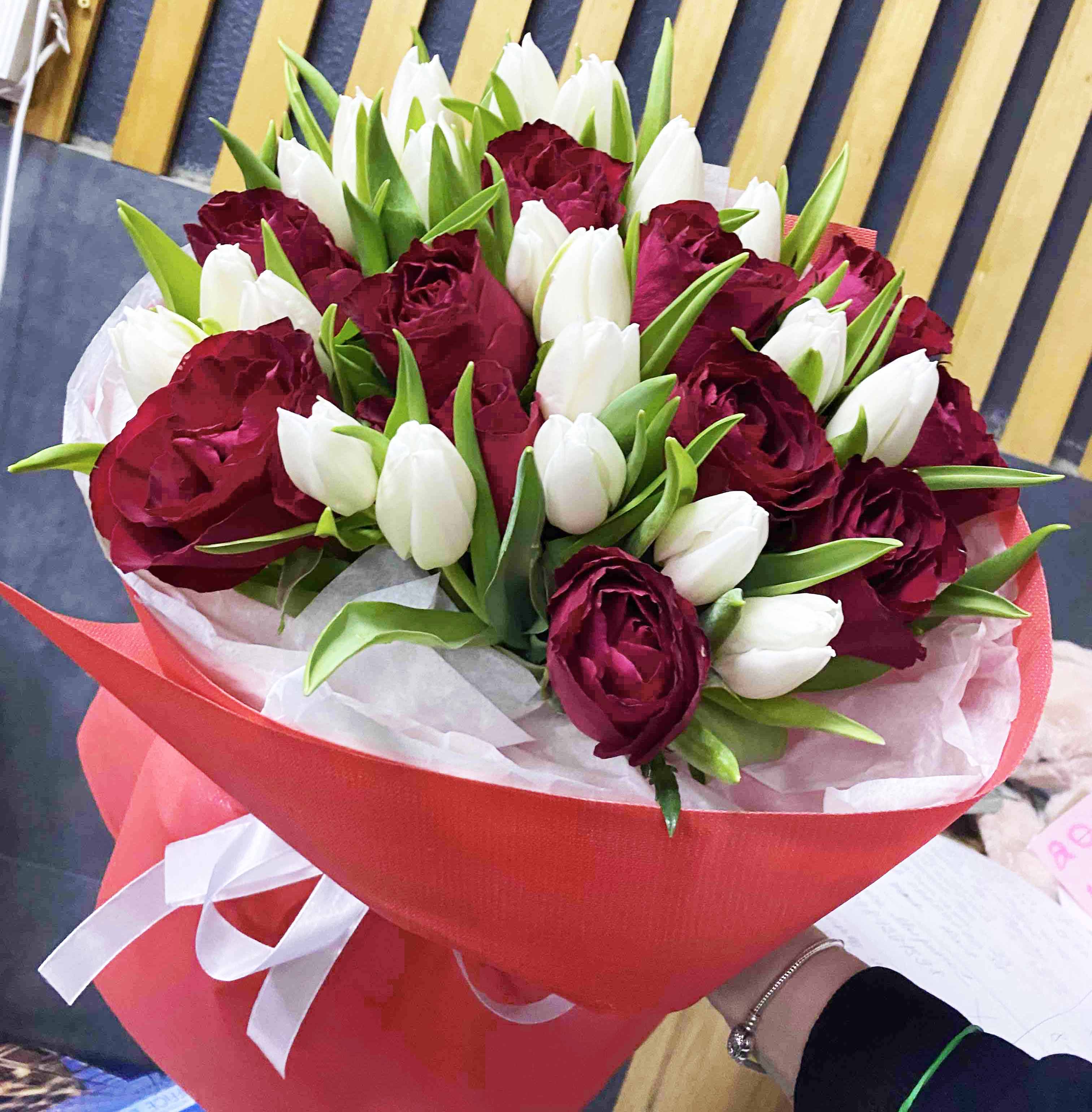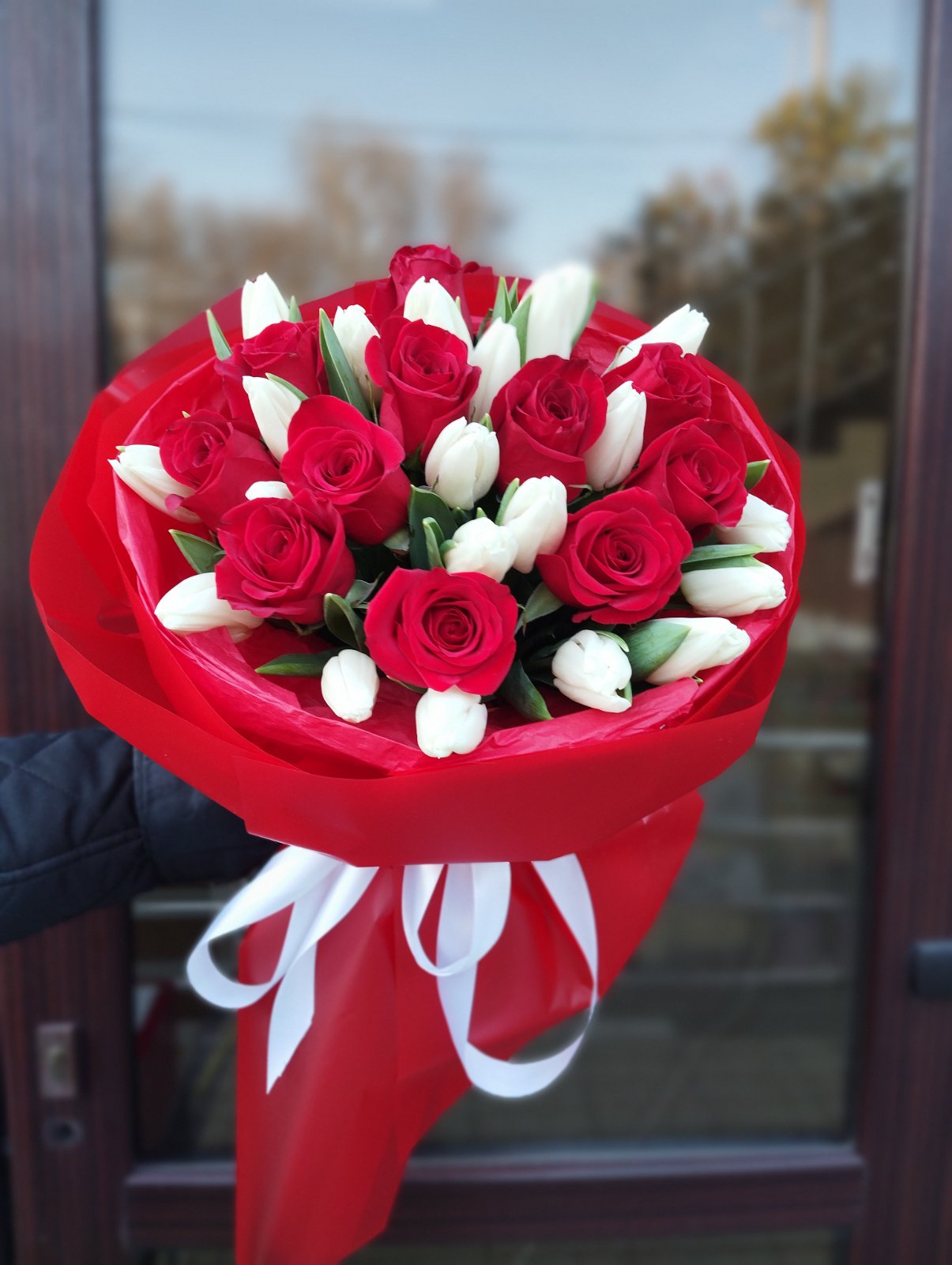 IMPORTANT : Bouquet of Bright Red or Crimson Roses and White Tulips is available apprx from January-February to April - at the tulips blossoming season. White tulips will be substituted with other cute white flowers if this bouquet is ordered at the other seasons.