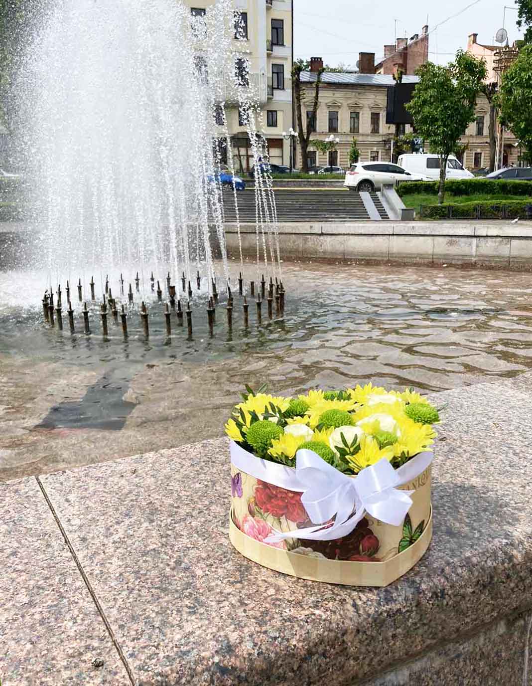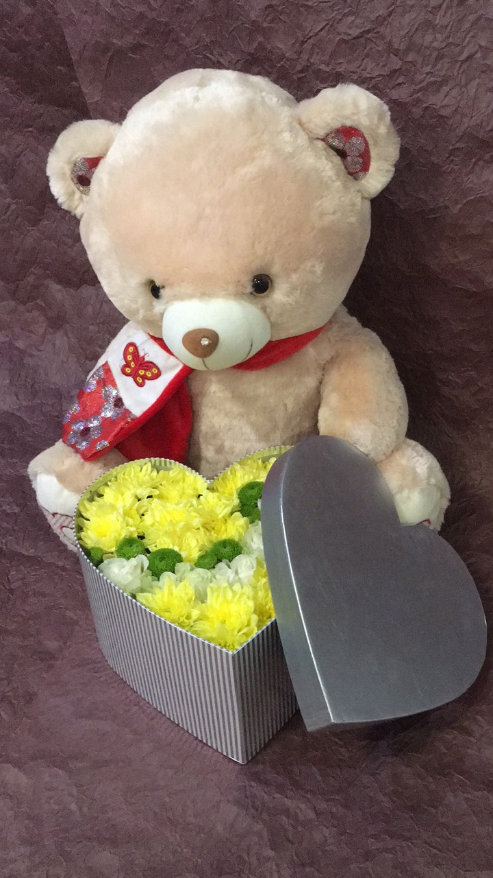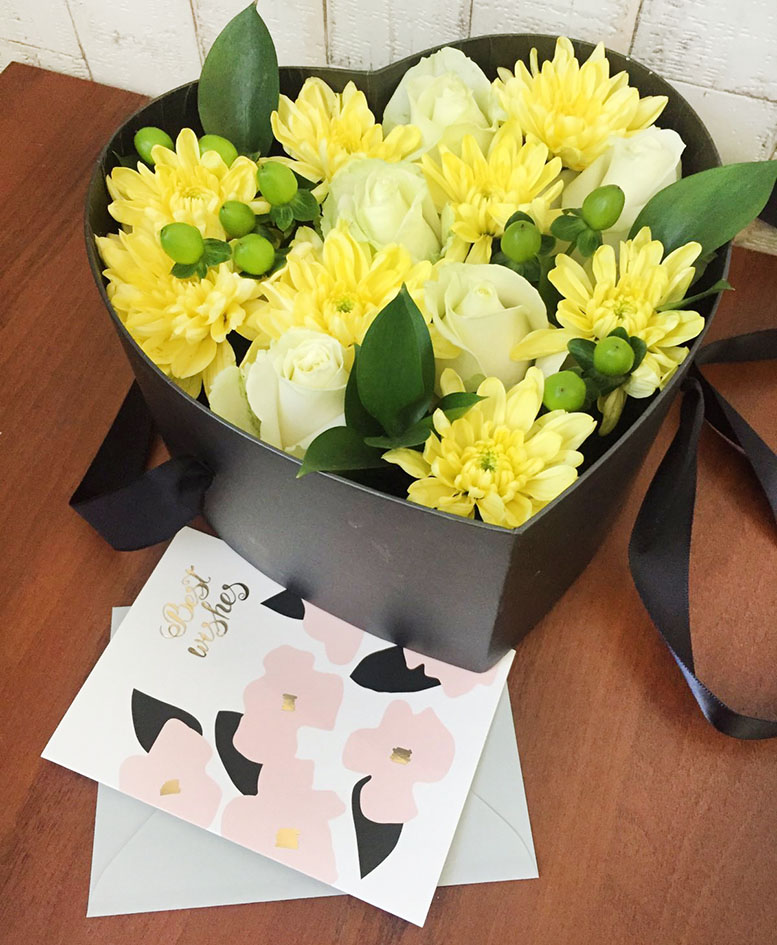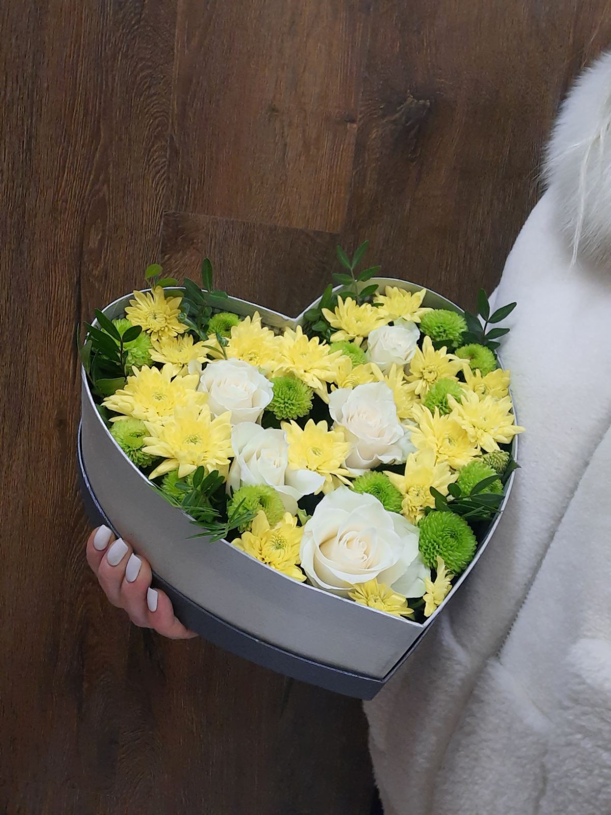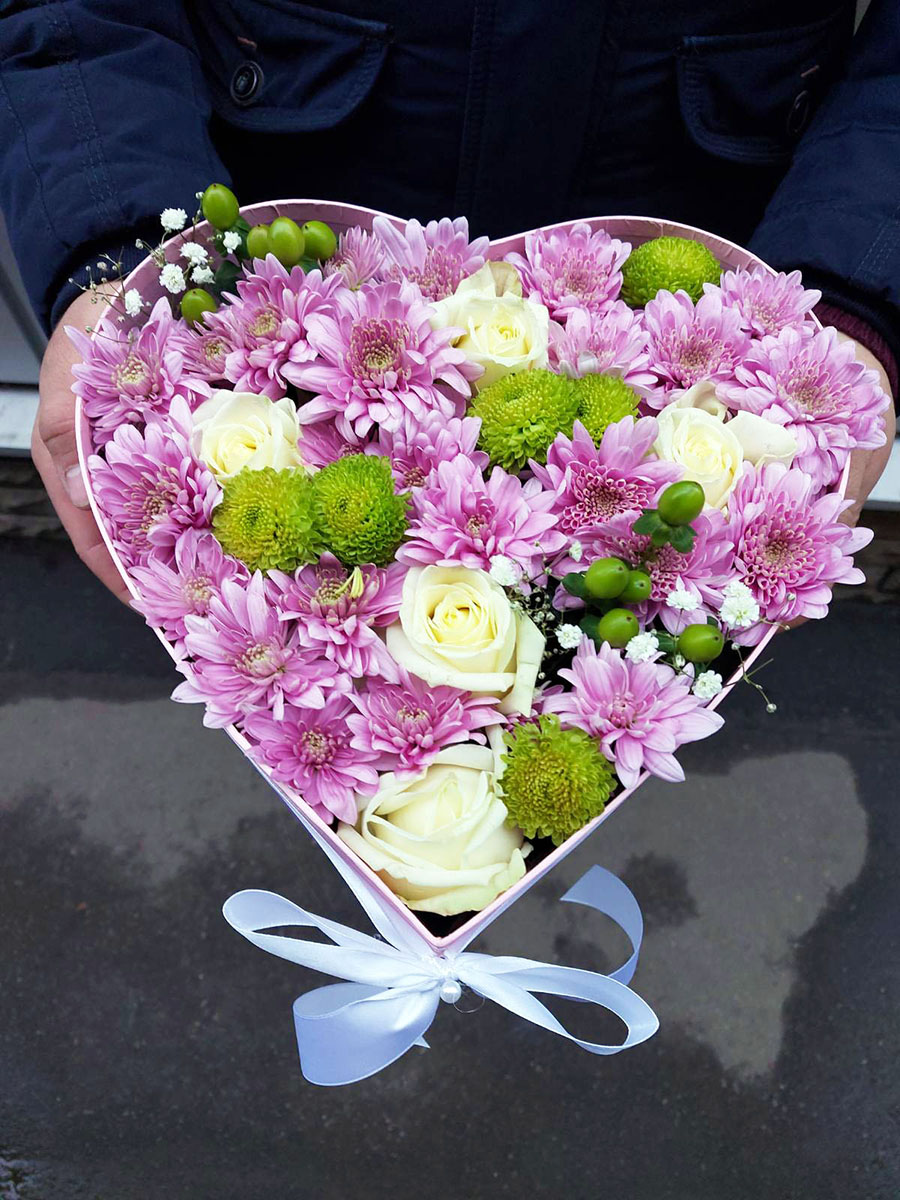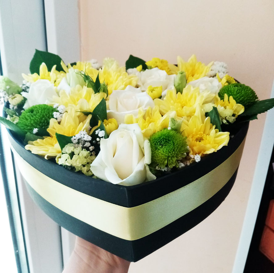 5 x Белых роз 3 x Желтые хризантемы коробка в форме сердца
