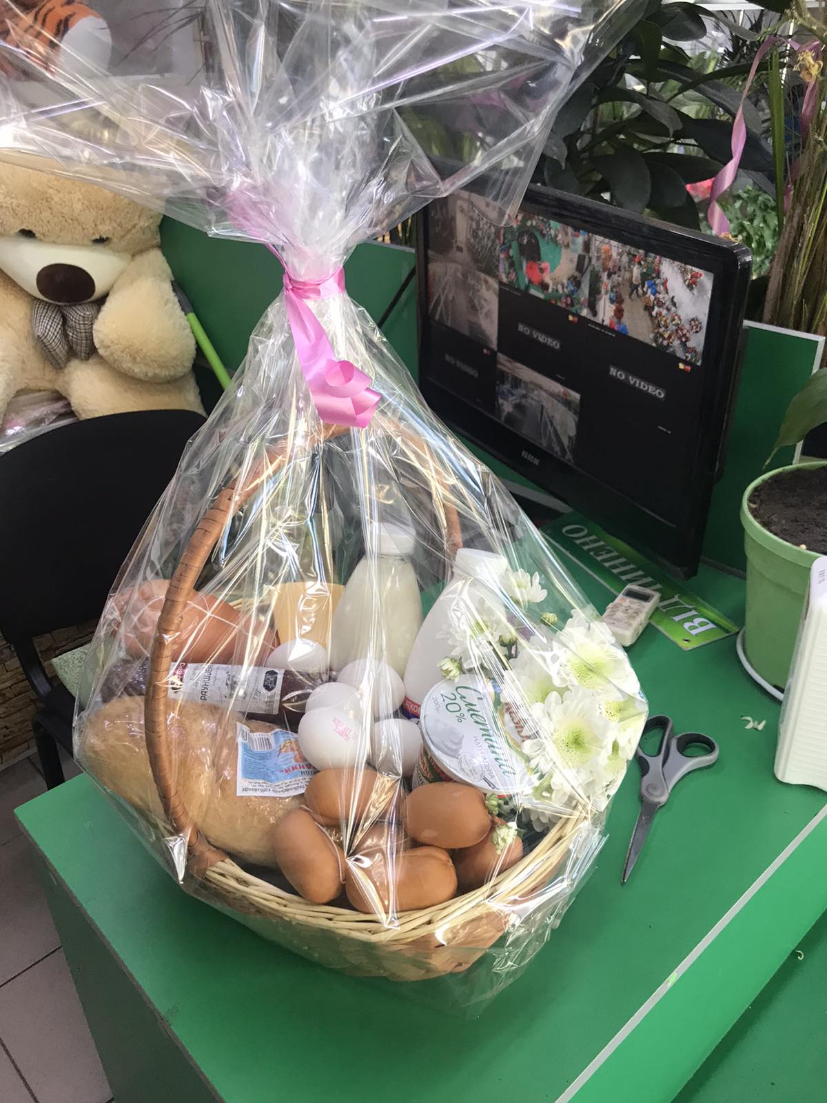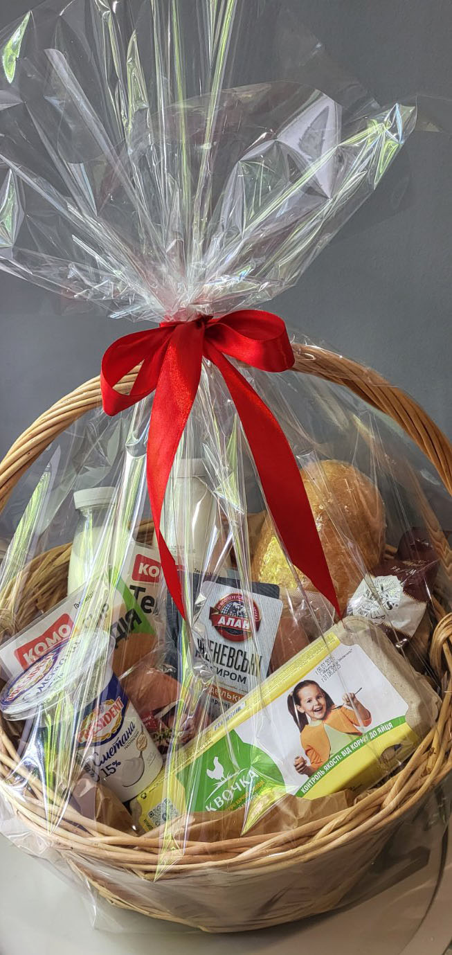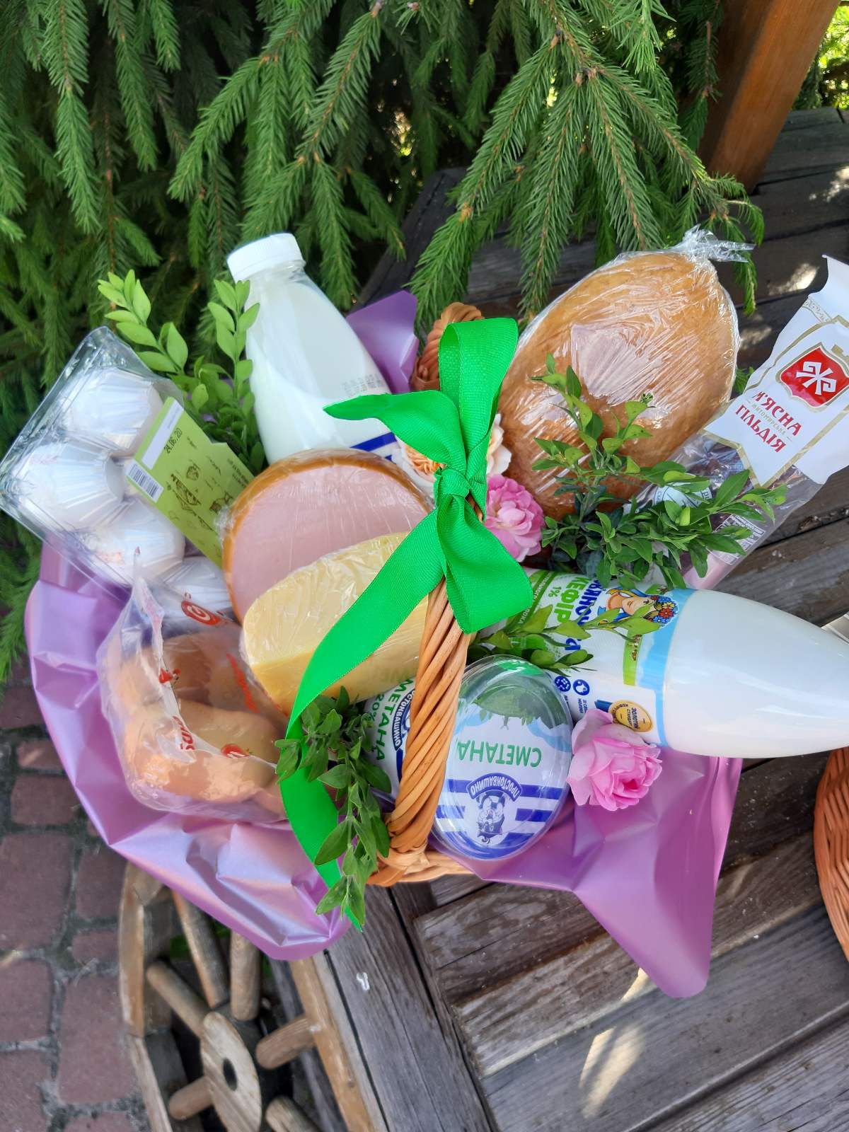 В этой корзине: бутылка молока, бутылка кефира, или ряженки, сардельки (300 гр), колбаса сырокопченая (300 гр), колбаса "Докторская" (300 гр), яйца (10 шт), сыр (250 гр), сметана (1 баночка), свежий белый батон.